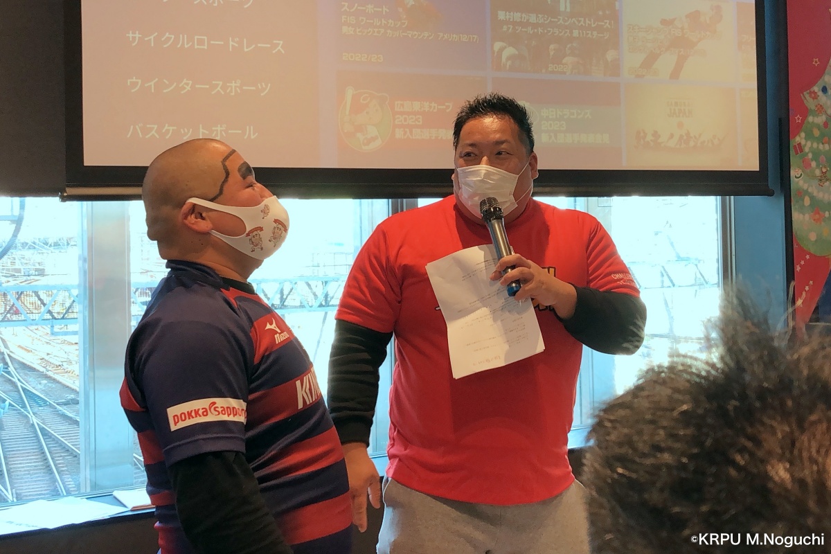 元ライナーズで現在はラグビーYoutuberとして活躍中のノッコン寺田さん、リーチマイルドさんが司会を務め、トークとともにゲームを観戦しました。