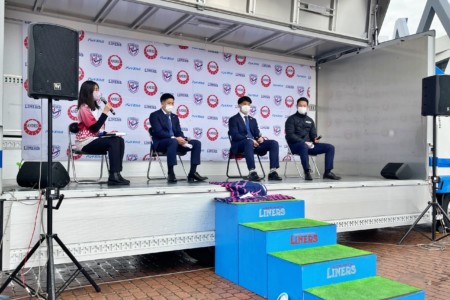 ライナーズの2023年度新加入選手のお披露目からスタートし、PR岩上龍・FL梅村柊羽・CTB/WTB金澤春樹の3選手がシーズンへの意気込みなどを話しました。