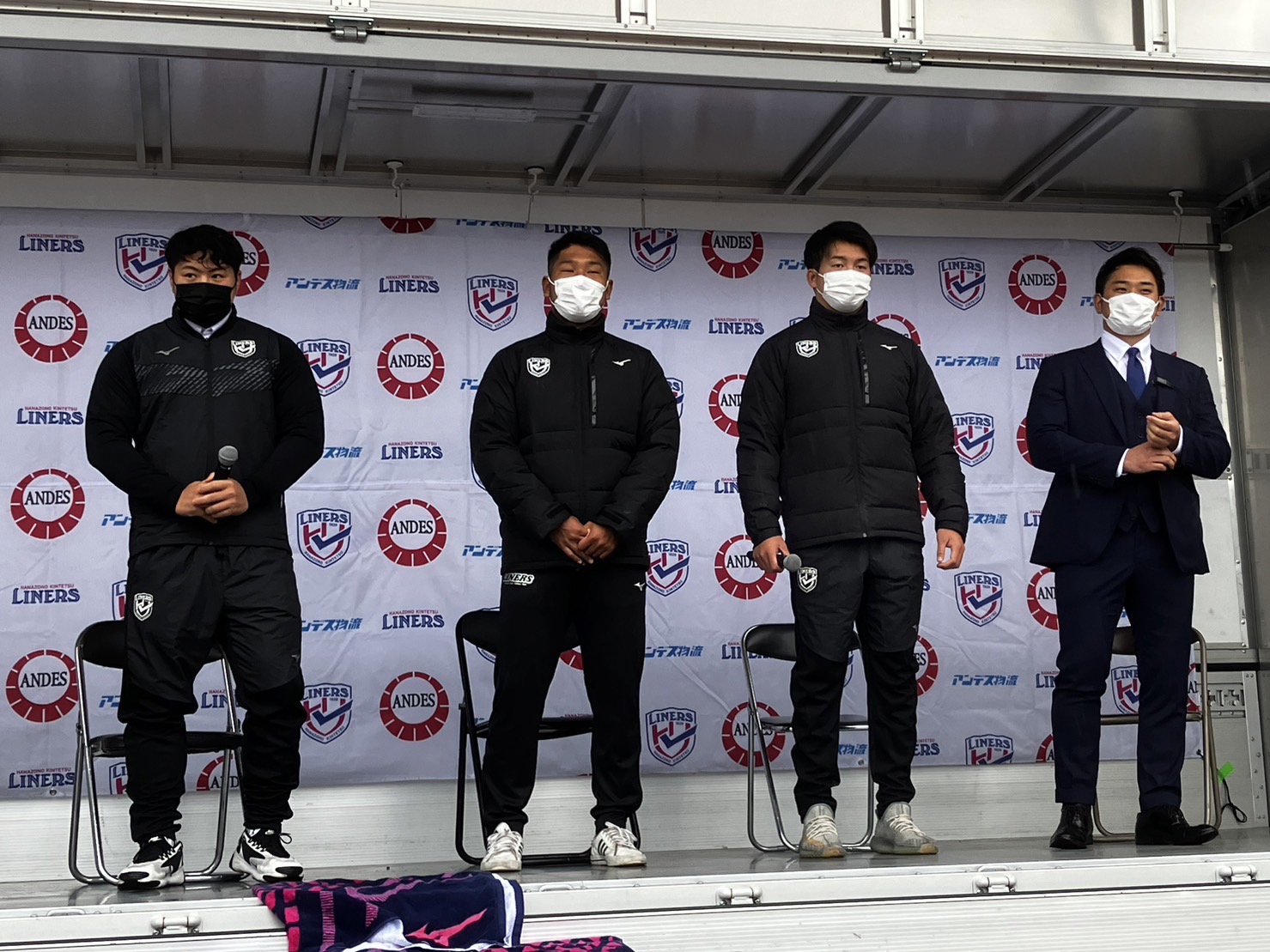 ライナーズの2023年度新加入選手のお披露目からスタートし、PR岩上龍・FL梅村柊羽・CTB/WTB金澤春樹の3選手がシーズンへの意気込みなどを話しました。