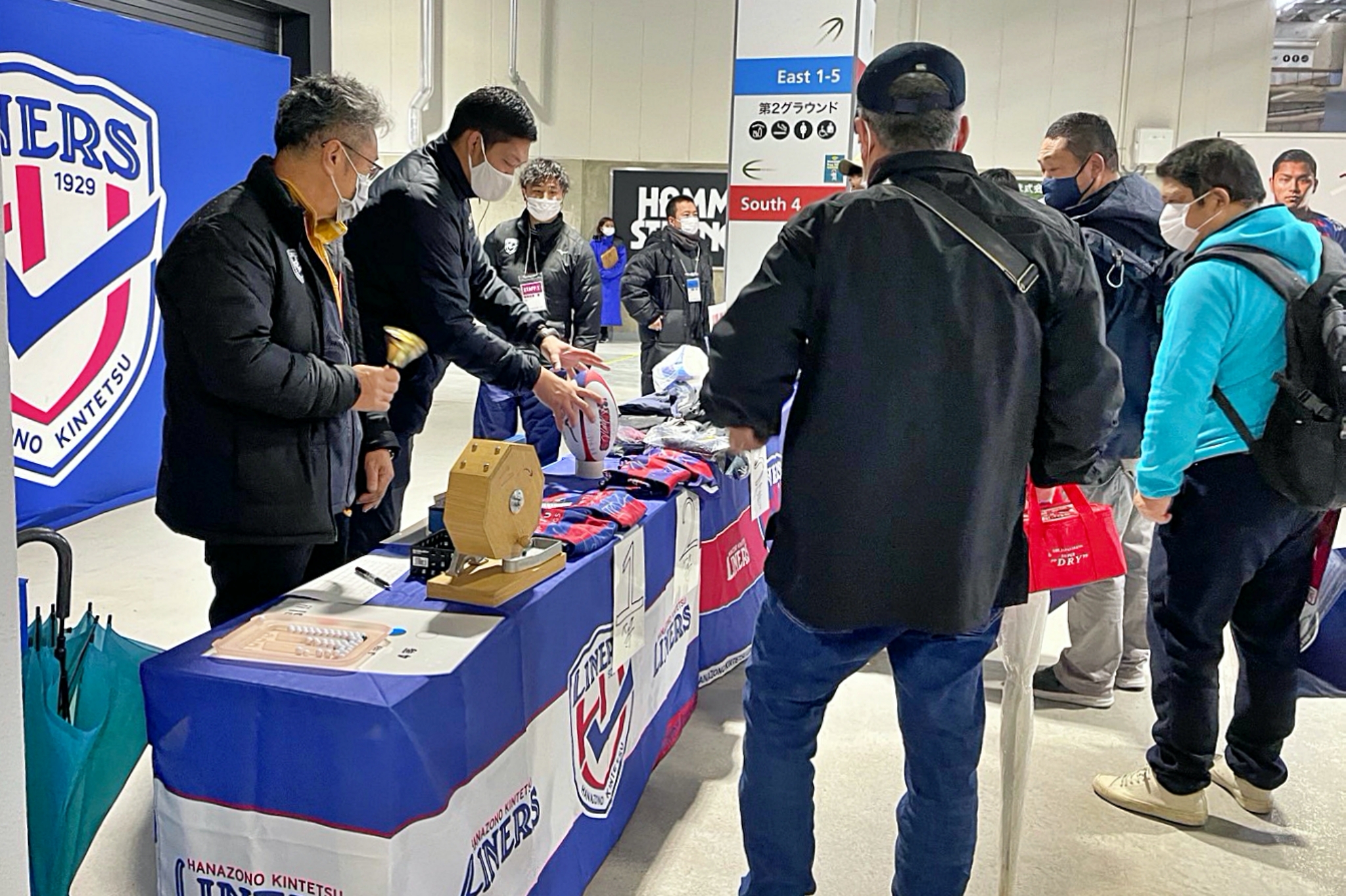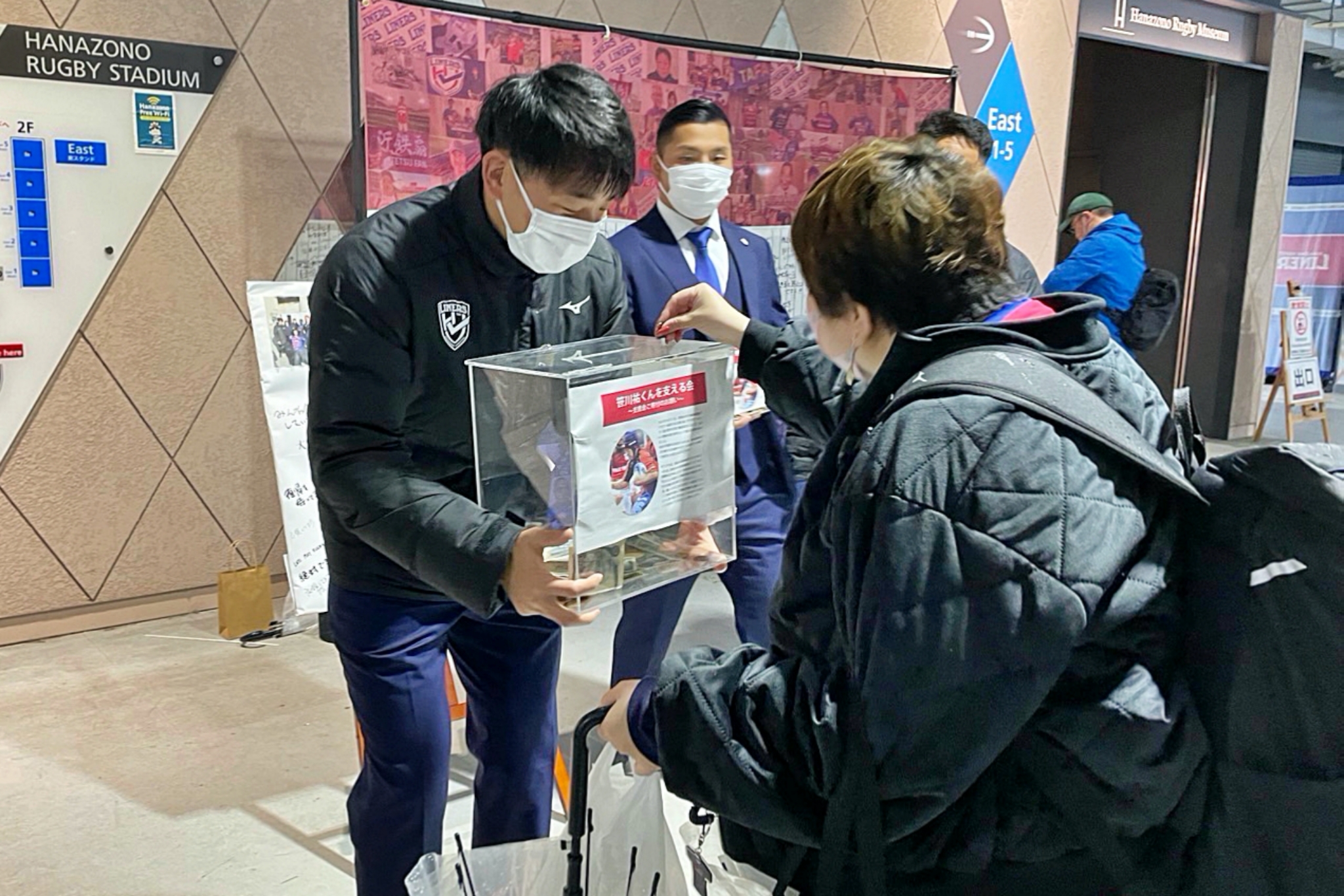 ラグビー場内では、笹川祐くんを支える会の募金活動、未来ジャージコンテストの投票、ライナーズ1,000円福引などを実施。ご協力いただいたみなさま、ありがとうございました。