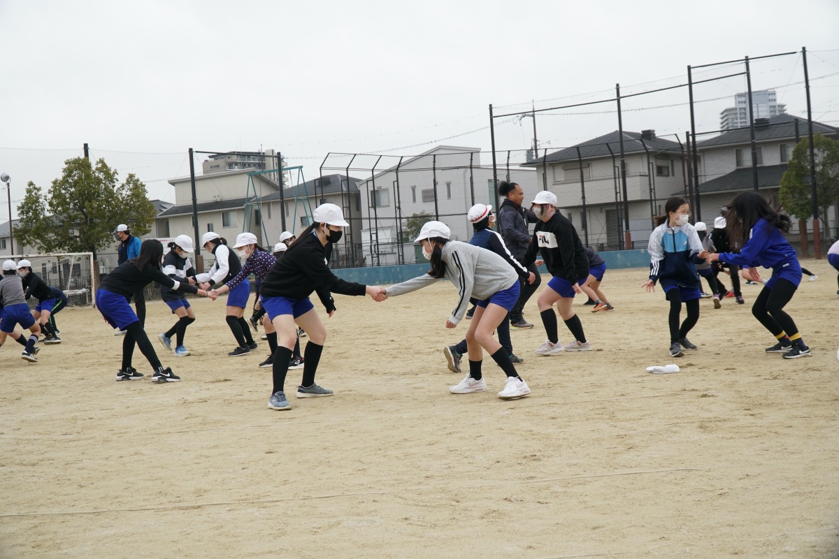 「One Team」をテーマに、ラグビーボールをつかってパスリレーなど体を動かしました。