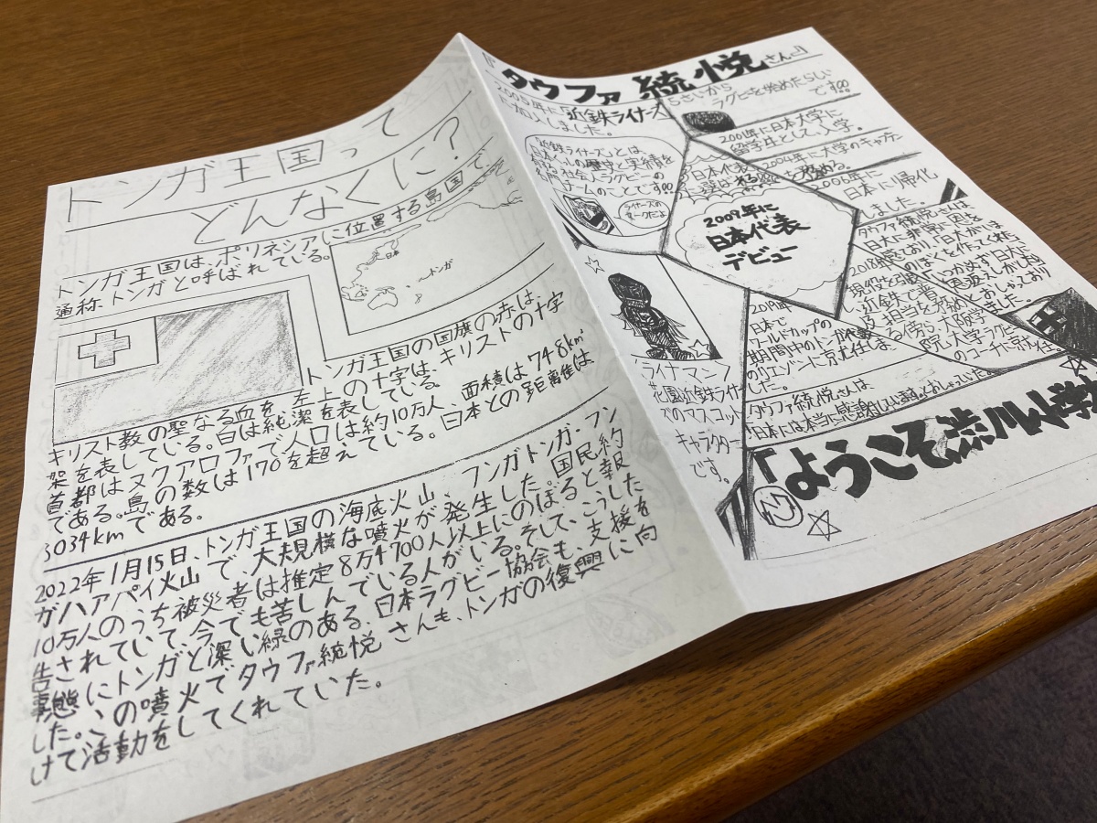 6年生のみなさんが事前に作成した資料には、トンガ王国やライナーズについての文章やイラストが。