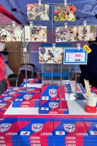 東大阪市のブースでは自転車のマナーアップキャンペーンの啓発を、ライナーズブースでは1,000円福引きのほか神セブンに選ばれた選手のサイン入りポストカードがもらえるバウムクーヘン販売などを行いました。