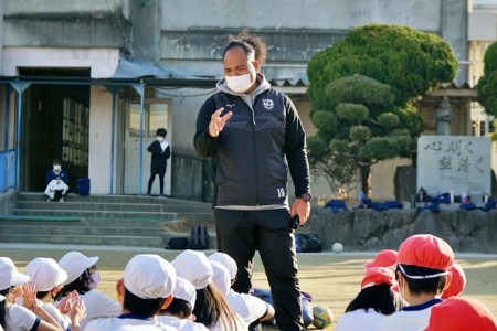 1月20日(金)、「花園近鉄ライナーズスクラム事業」の一環で、東大阪市立孔舎衙(くさか)小学校の4年生に向けてラグビー体験および講話を実施しました。