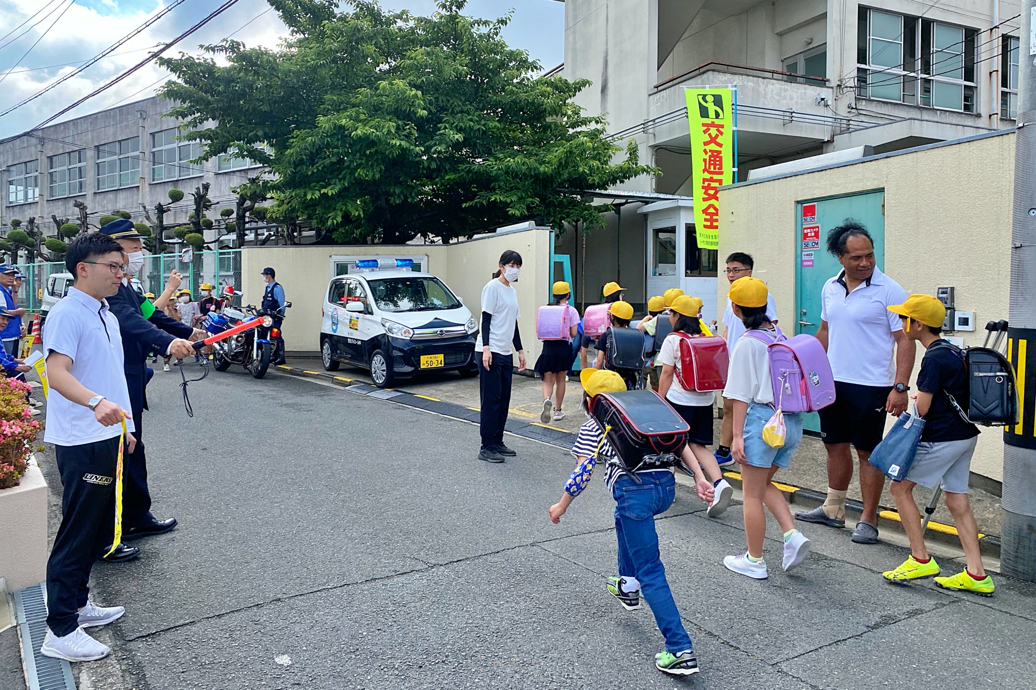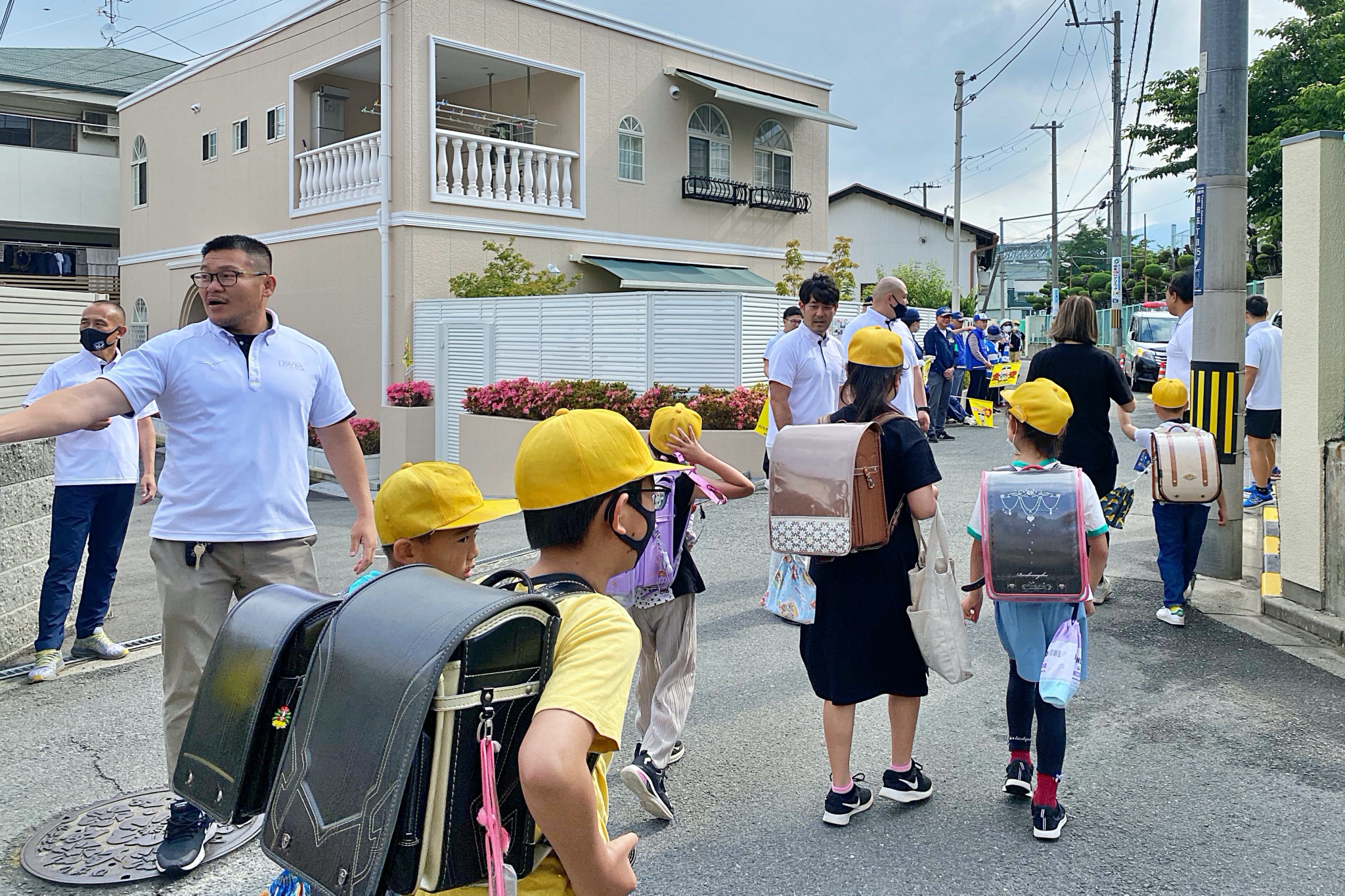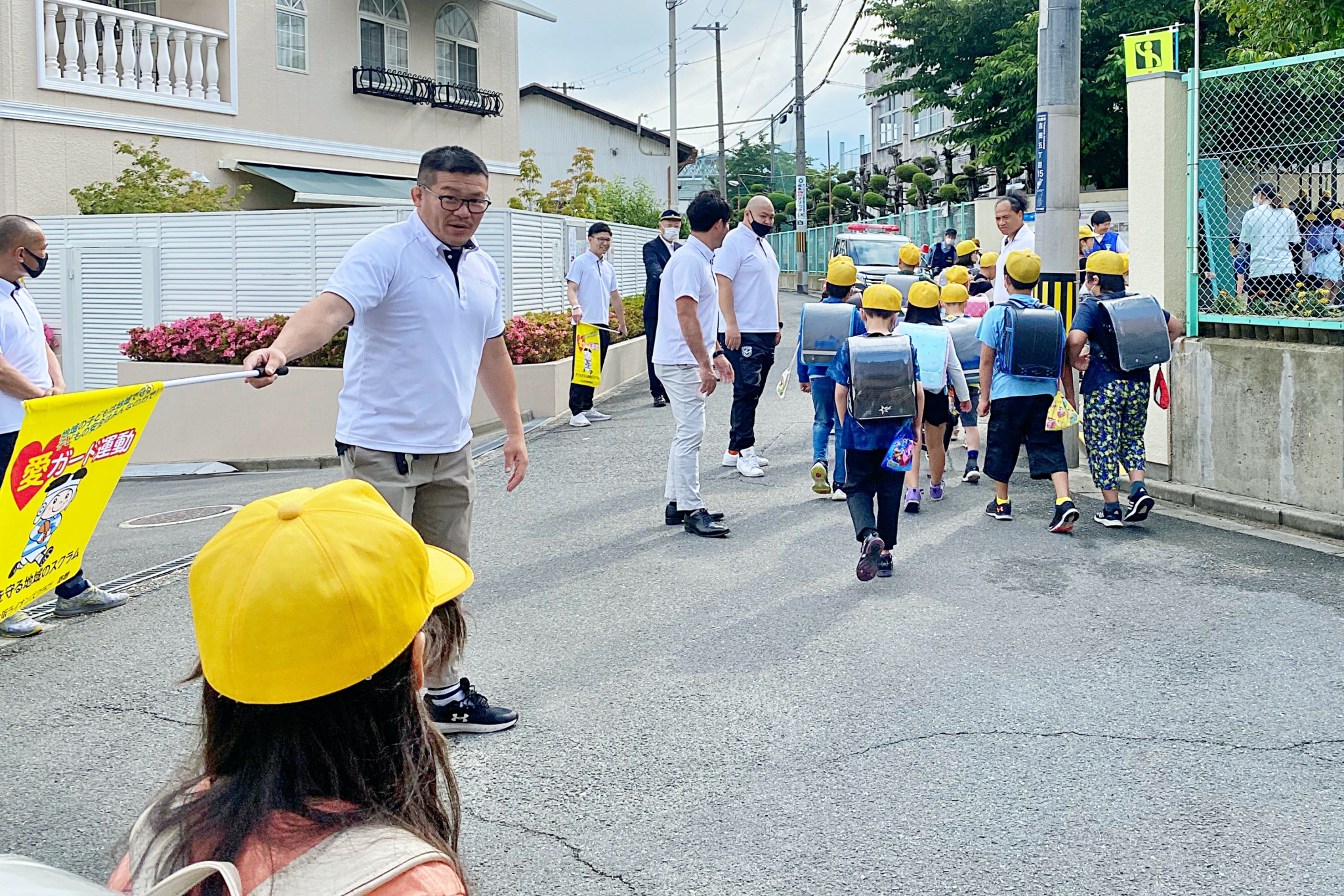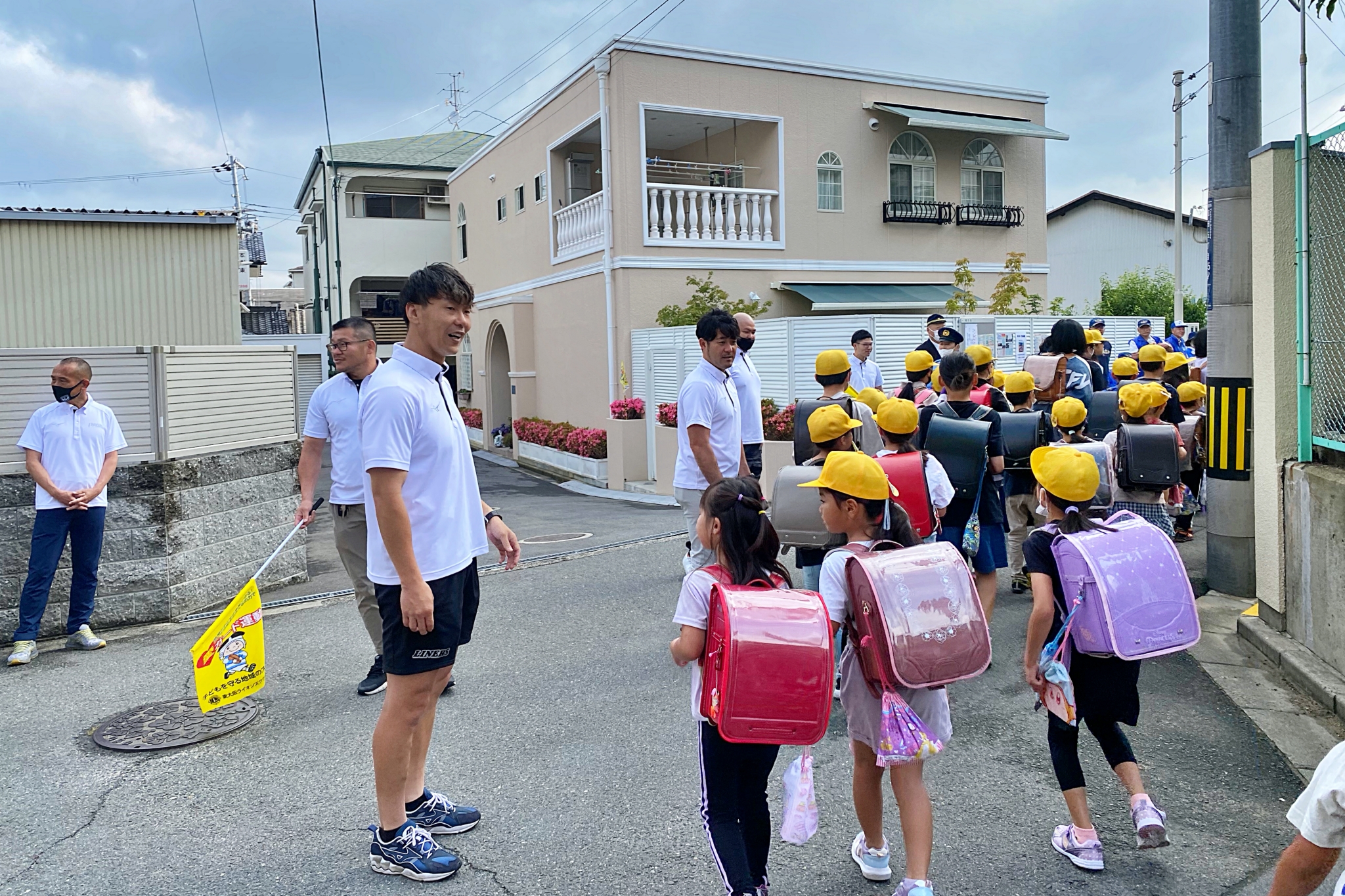 愛ガード運動は、東大阪市の小学校で児童の登校を見守る活動です。毎日活動されている「見守り隊」のみなさんと一緒に活動しました。