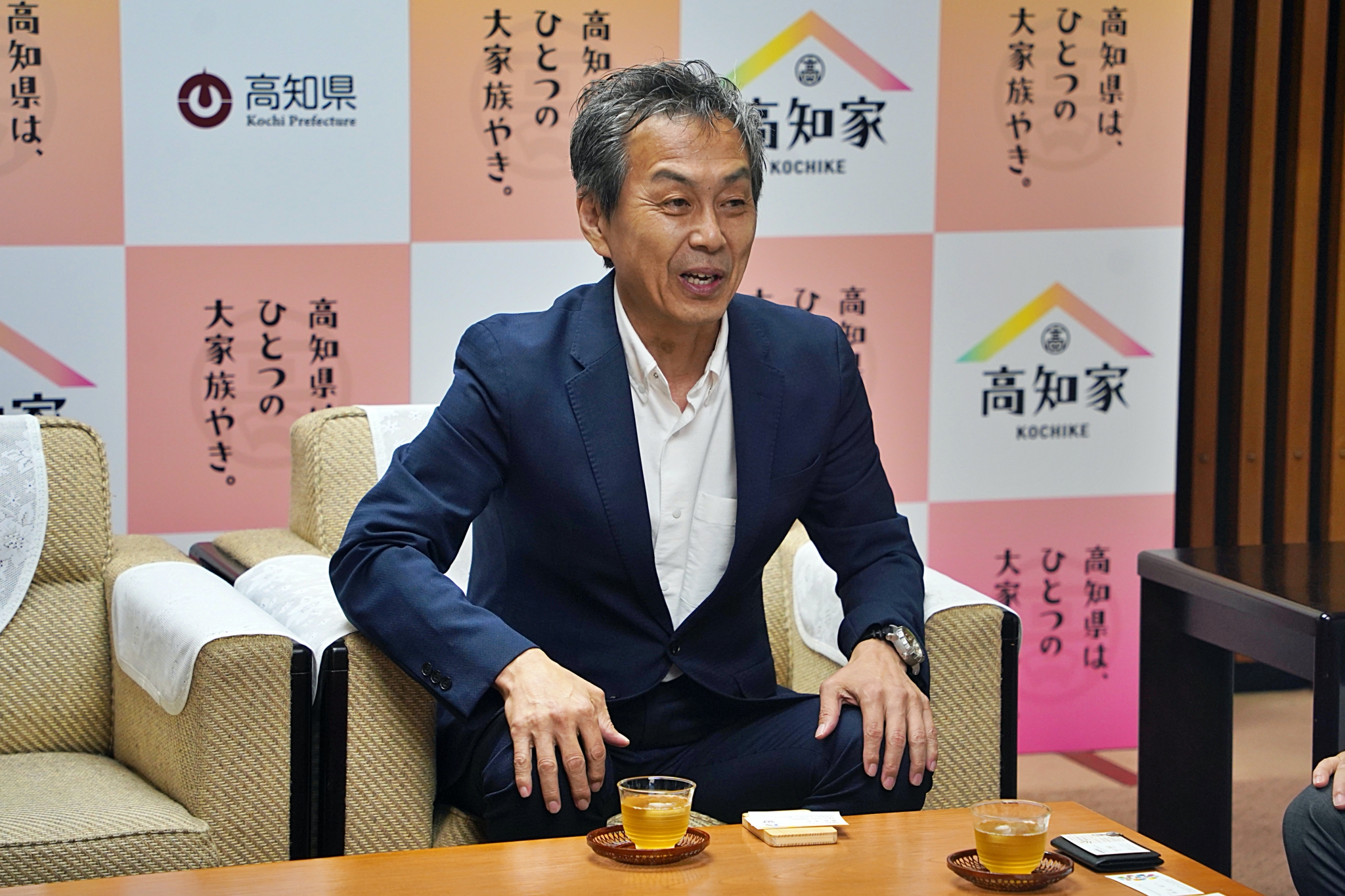 飯泉GMが「宿舎やグラウンドがとてもきれいで食事もおいしい。本当に良い環境で合宿をさせていただいています」と話すと井上副知事からは、「高知のおいしいものを食べて合宿がんばってください。応援しています」と激励いただきました。
