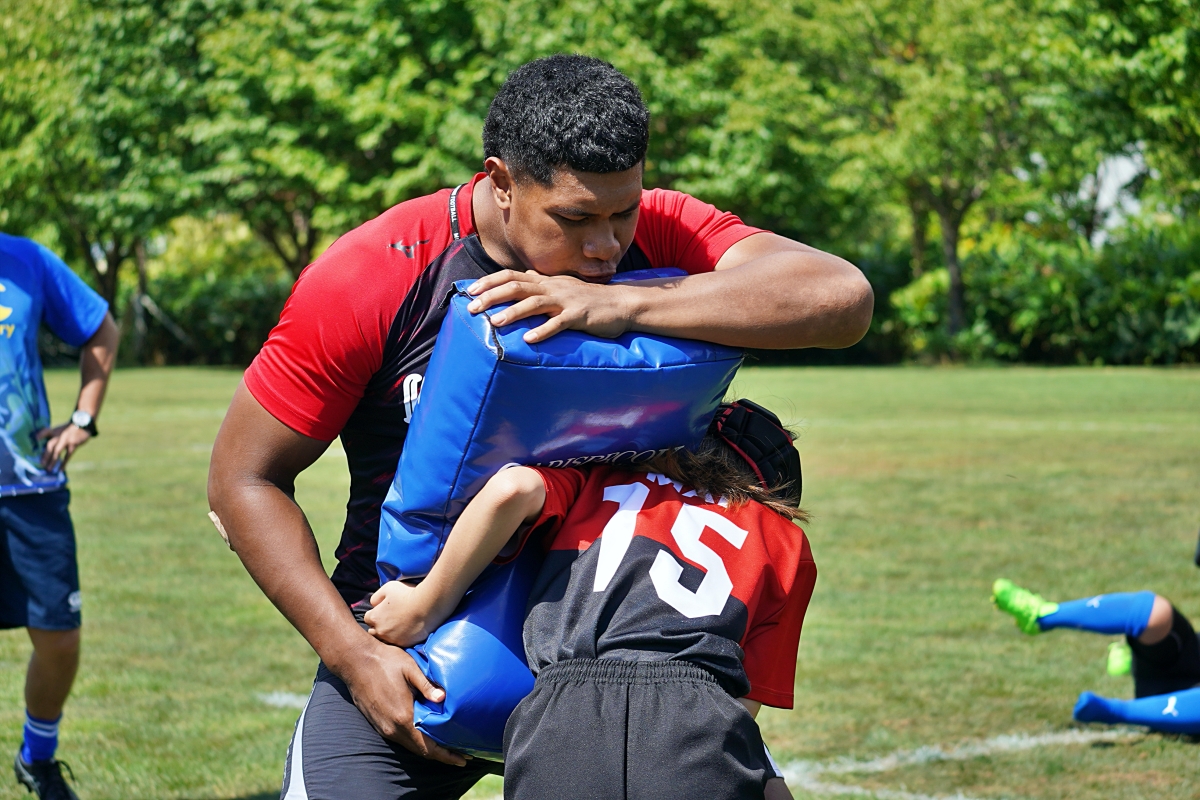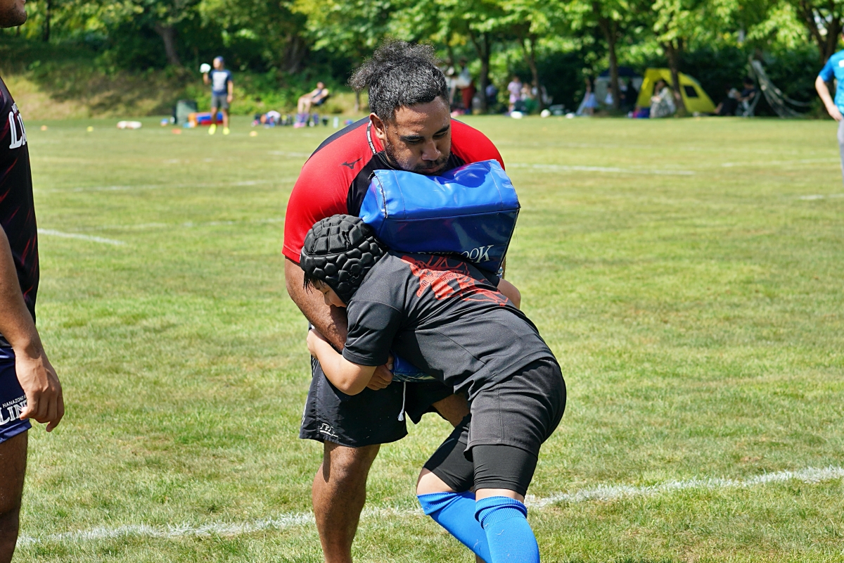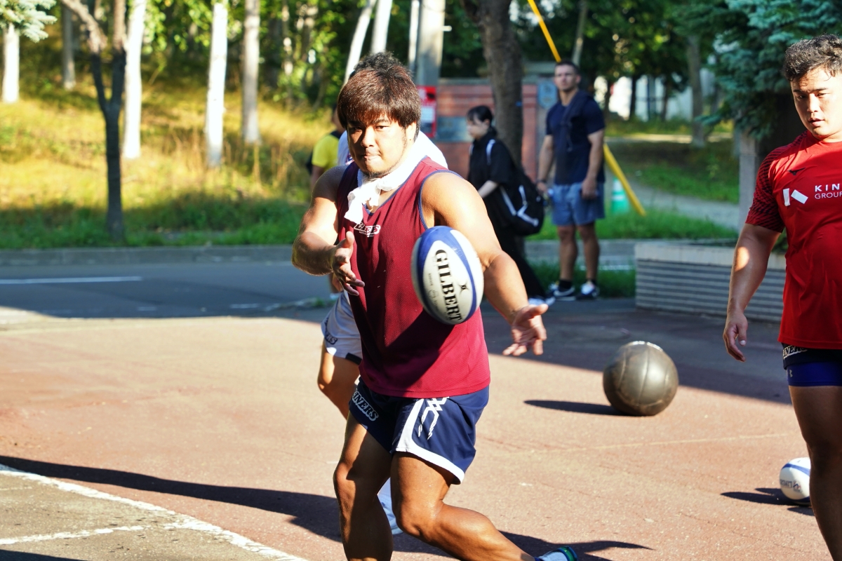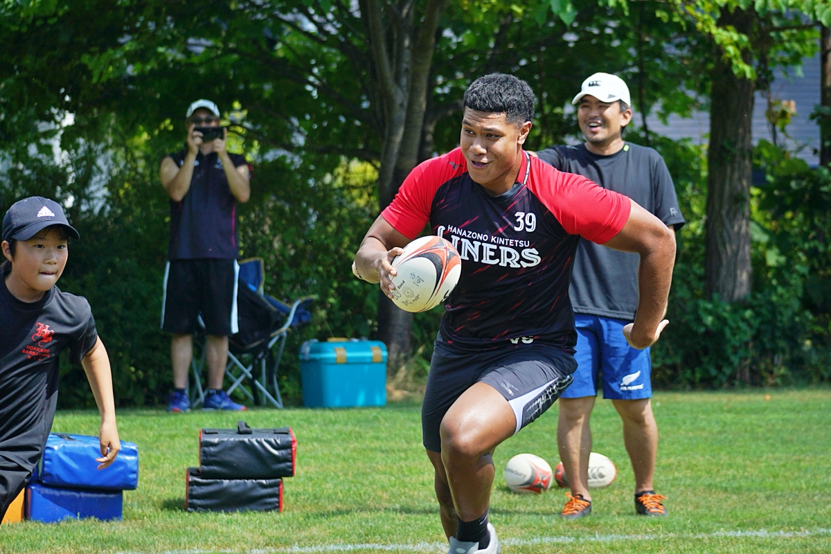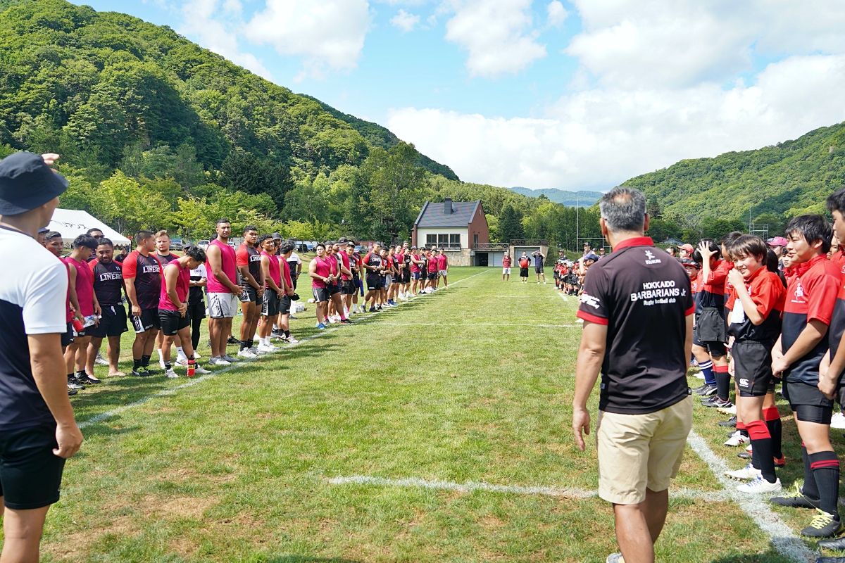 4日目の8/26(土)はラグビークリニックを実施。グループに分かれて、北海道バーバリアンズジュニアのみなさんを中心に、北海道でラグビーをしている小中学生へラグビー指導を行いました。