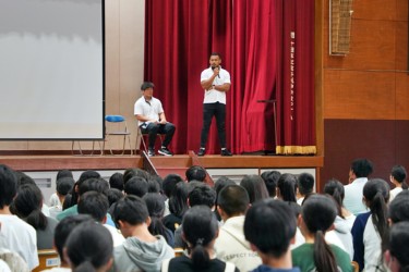 2023年10月18日(水)、奈良市立平城中学校にて「ライナーズ絆プロジェクト」を実施。タウファ統悦普及担当、横井隼選手、ツポウ テビタ選手が職業講話を行いました。