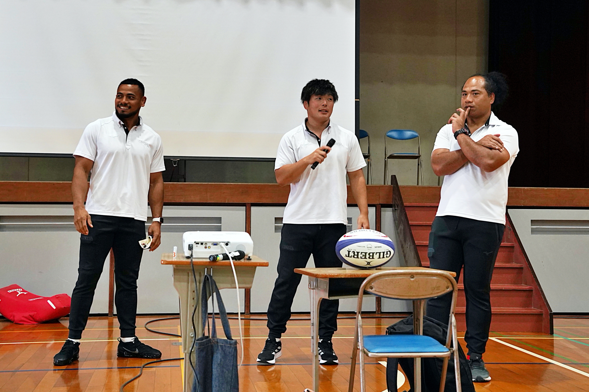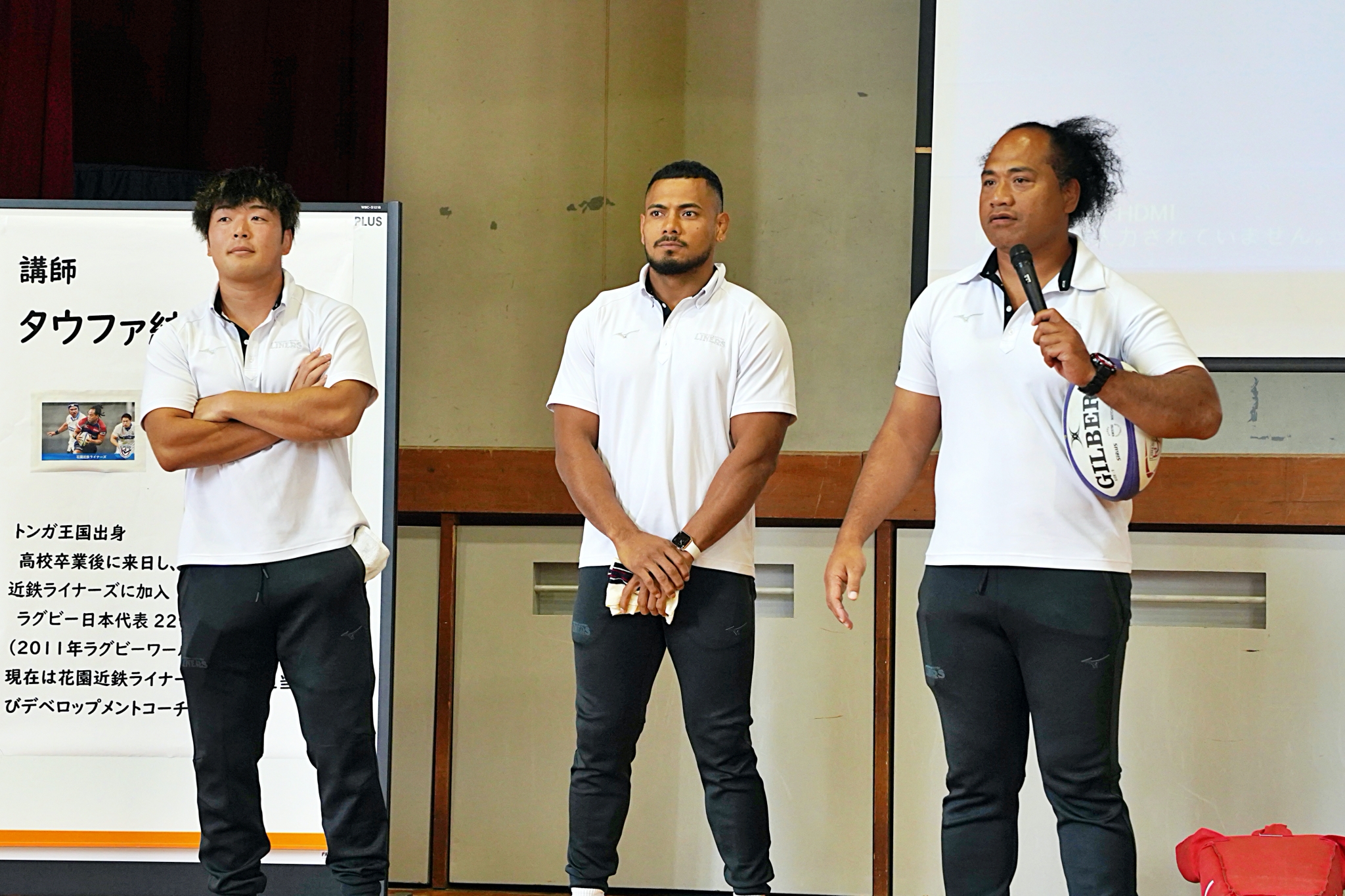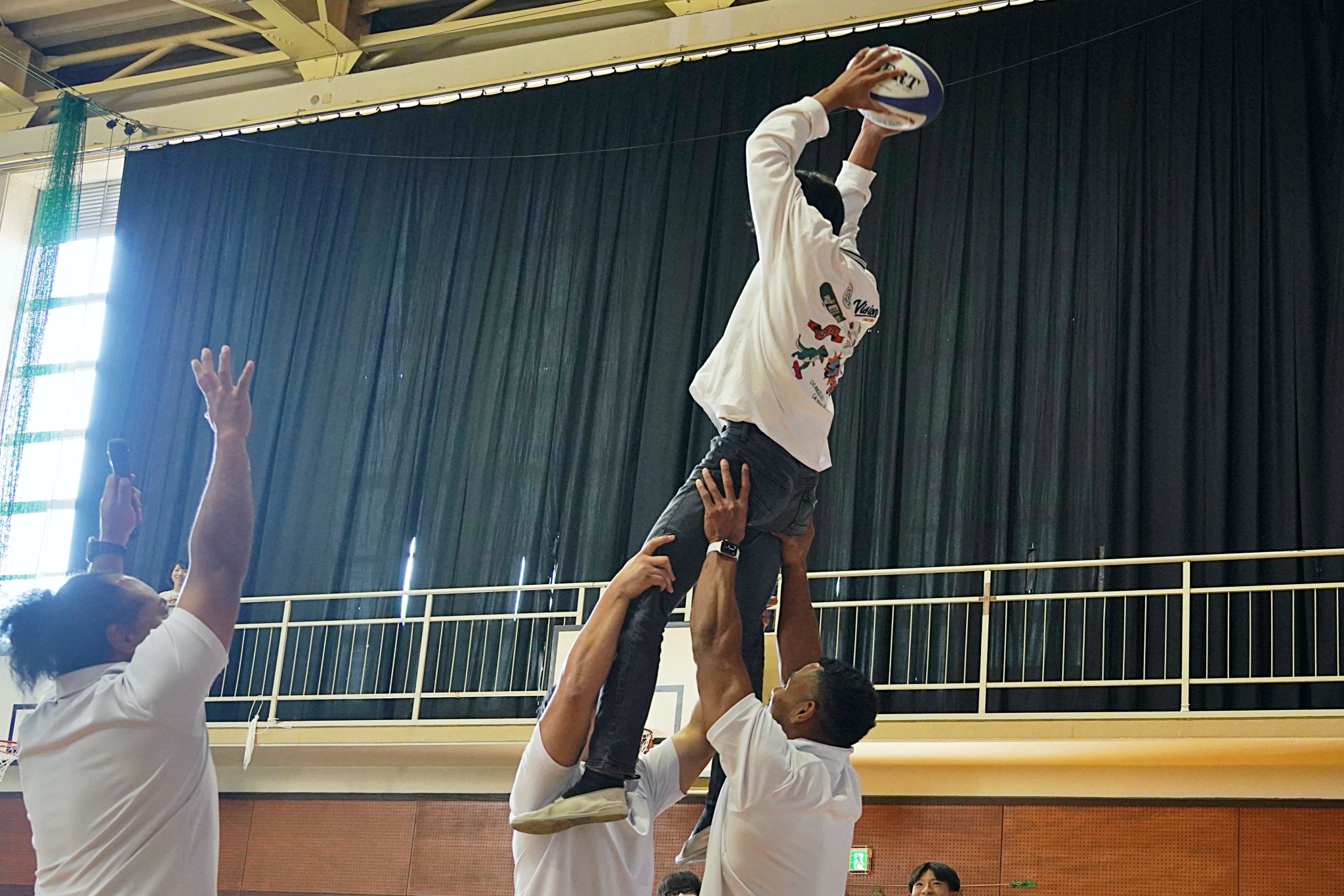 講話の前にタックル体験やラインアウト体験など、少しラグビー体験をしてから講話に。