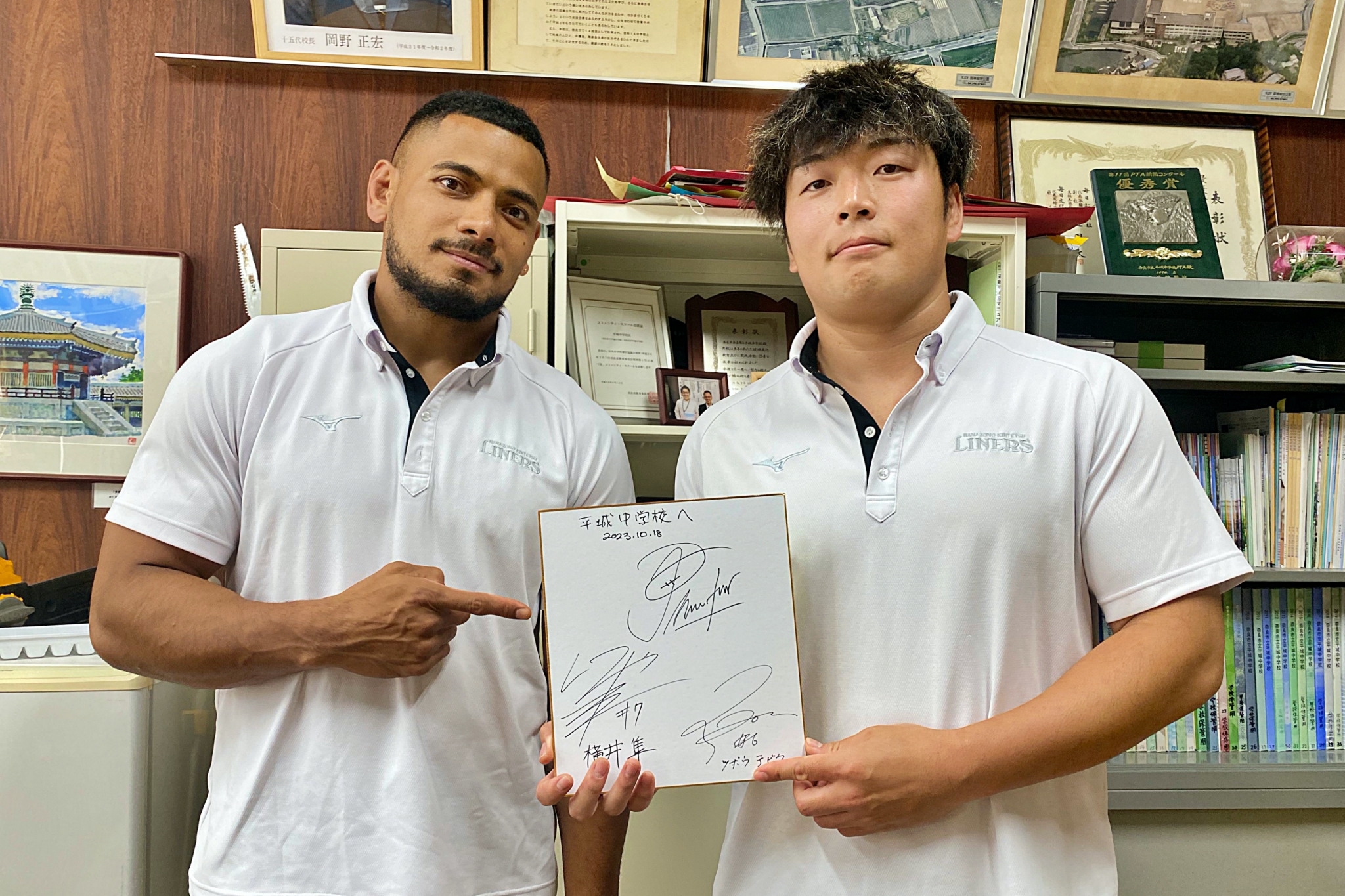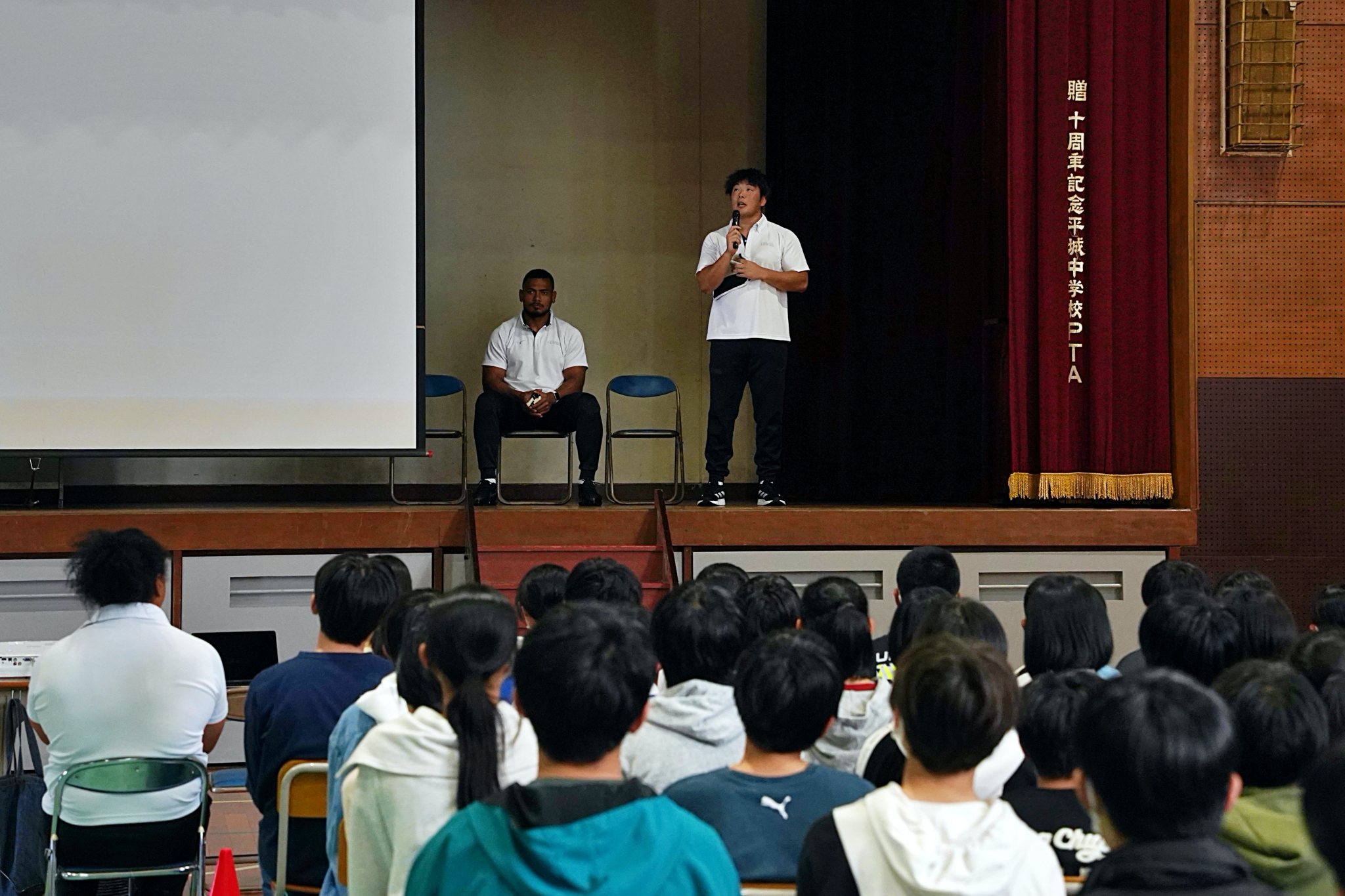 2023年10月18日(水)、奈良市立平城中学校にて「ライナーズ絆プロジェクト」を実施。タウファ統悦普及担当、横井隼選手、ツポウ テビタ選手が職業講話を行いました。