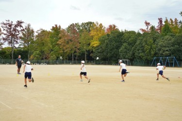 テーマは「協力」。はじめに協力についての講話をし、その後グラウンドに移動してラグビー体験を行いました。特にラグビーボールを使ったリレーでは、全員が声を出して最後の児童がゴールするまで応援していて、しっかり協力できていました。