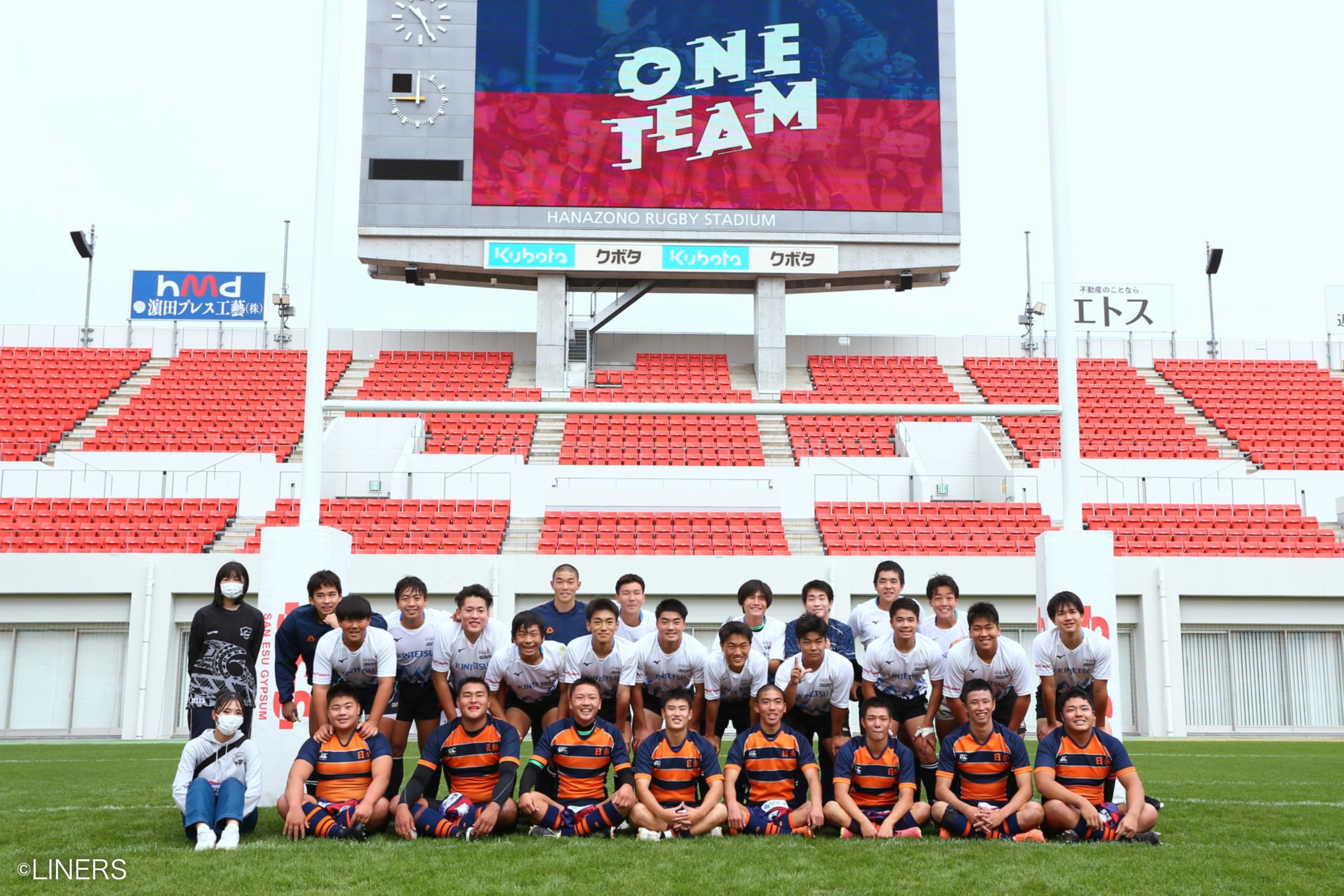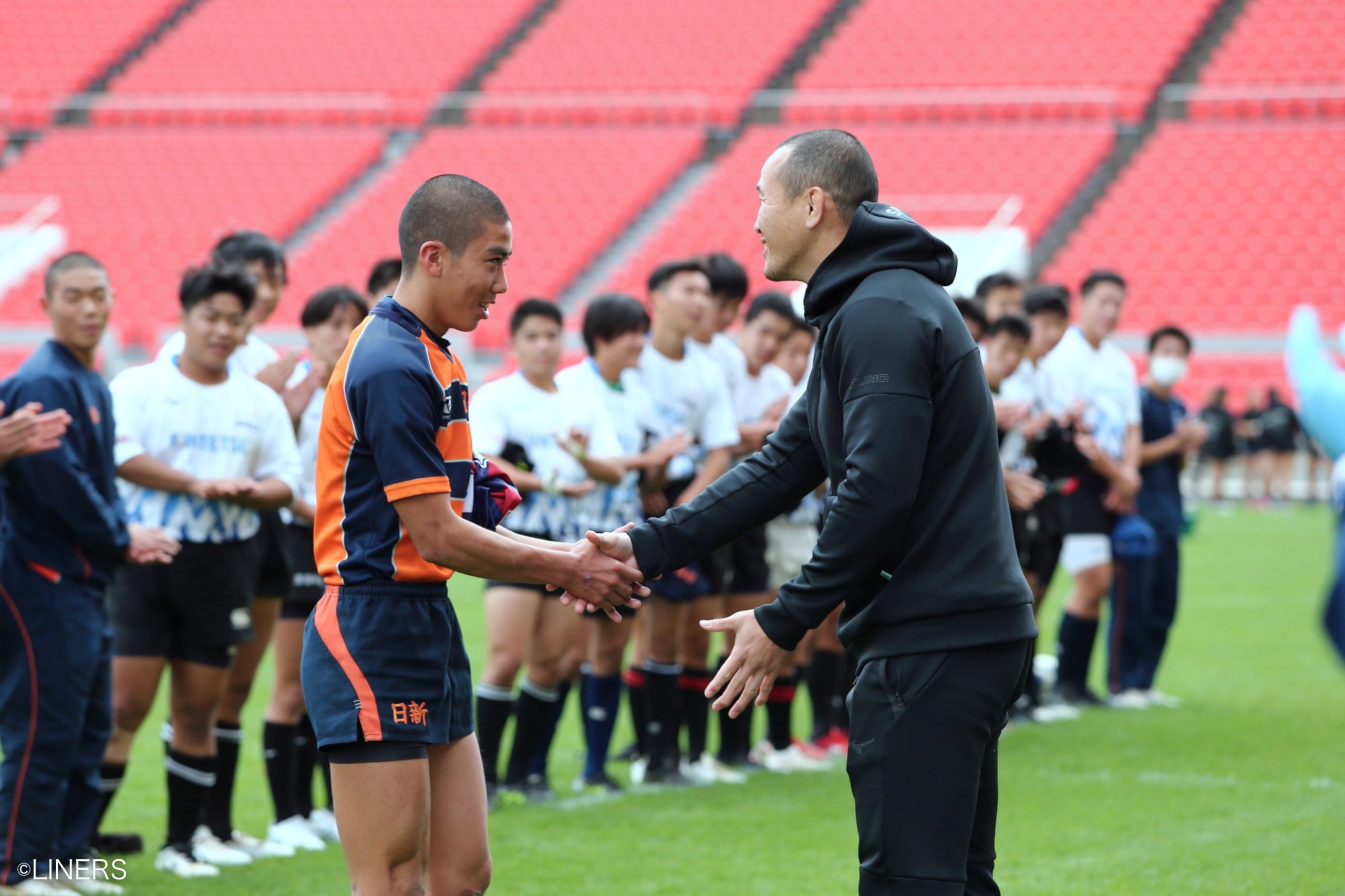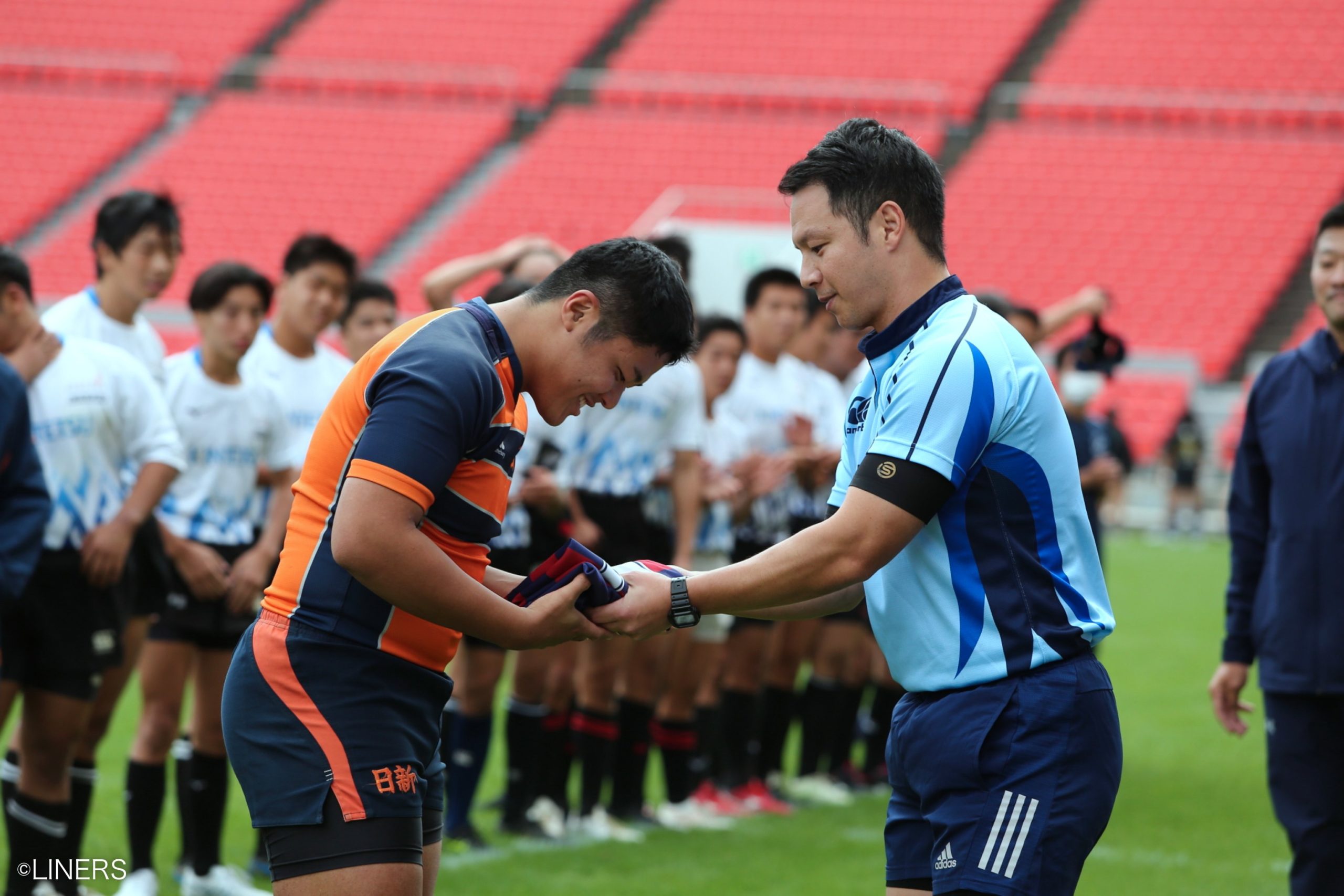 レフリーには元ライナーズ選手の南藤辰馬さんを招致。自身も慣れ親しんだ花園のグラウンドで笛を吹いていただきました。