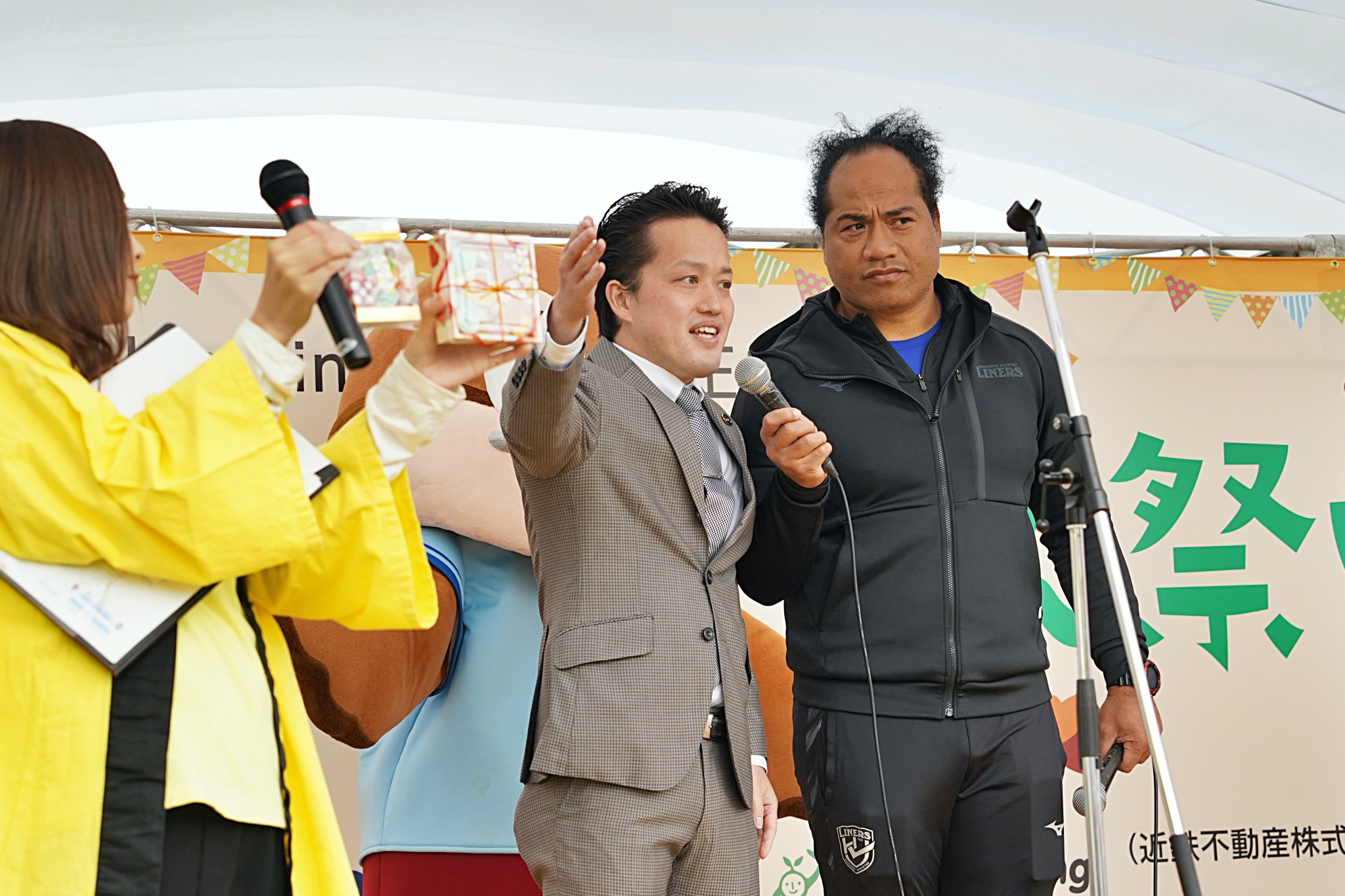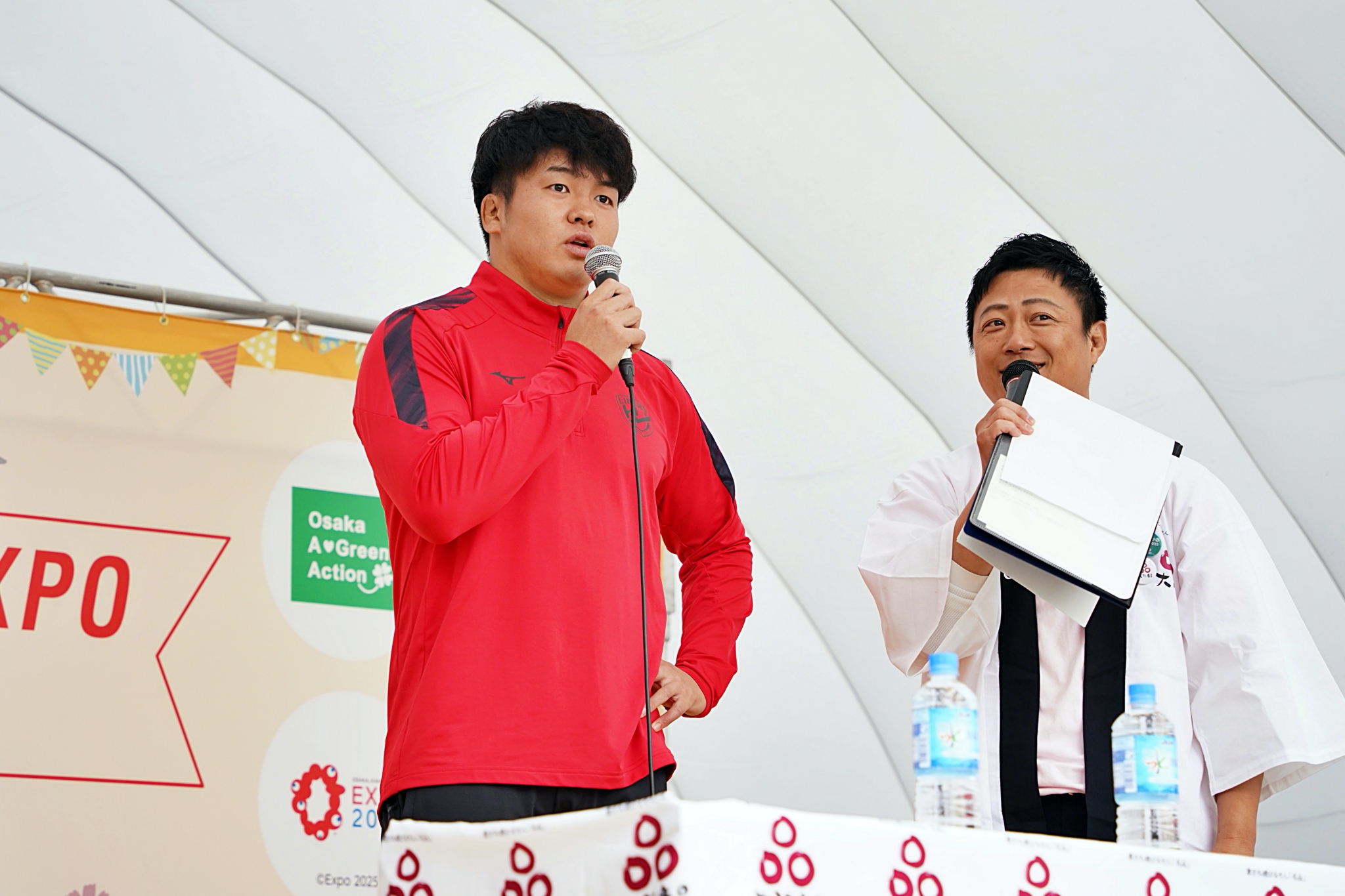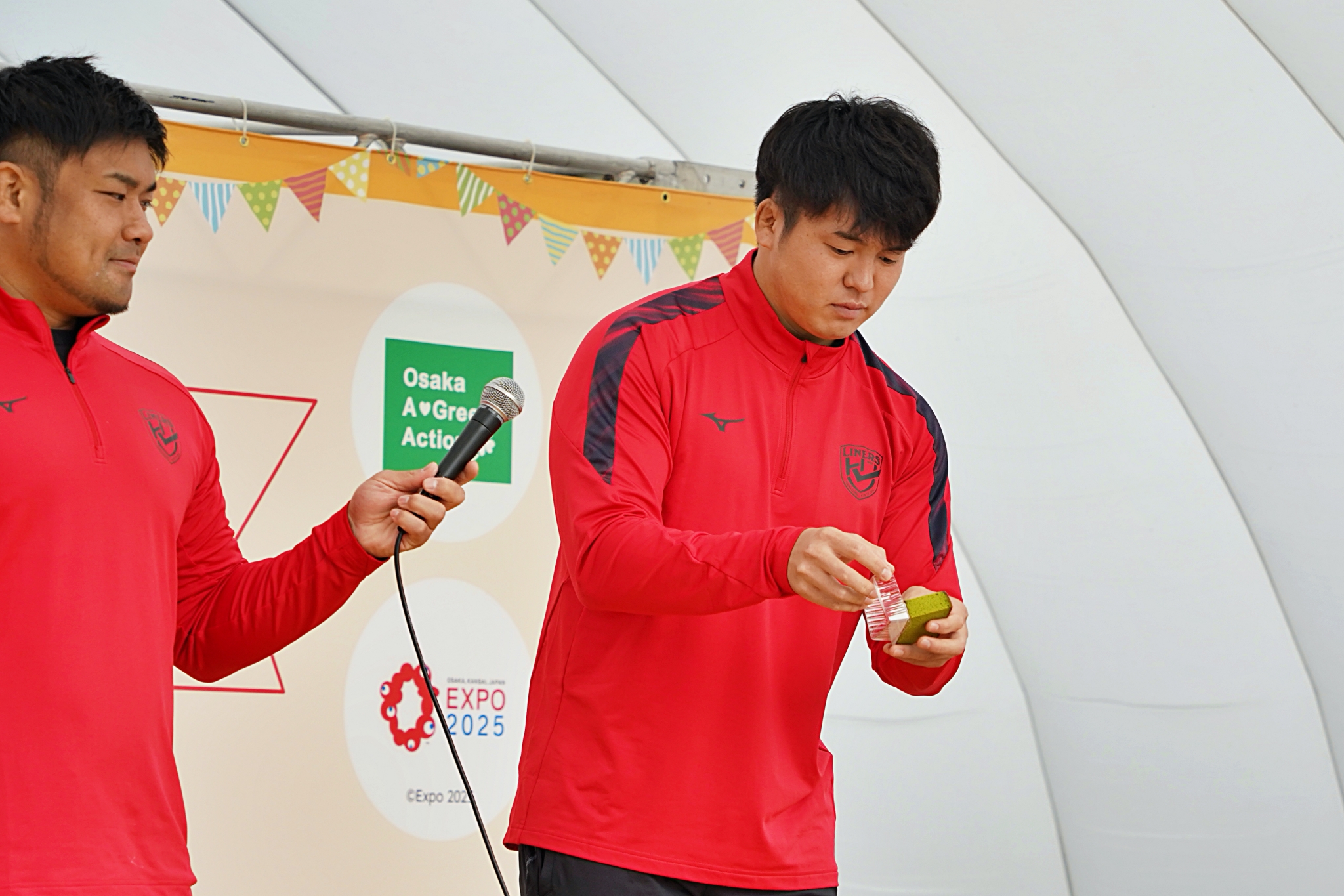 佐々木駿、梅村柊羽、ジェド・ブラウンの3選手が参加。大阪産(もん)に関するトークショーや大阪産(もん)の食レポを行い、会場を盛り上げました。