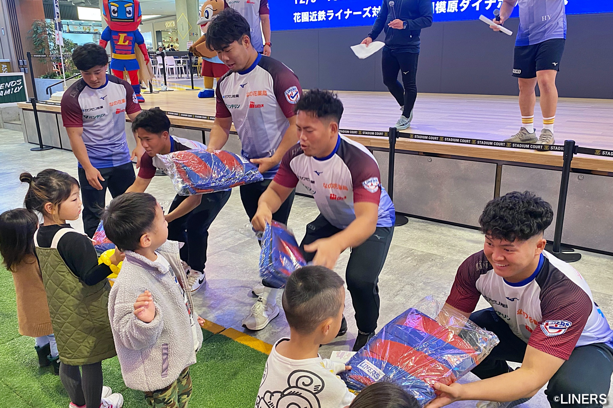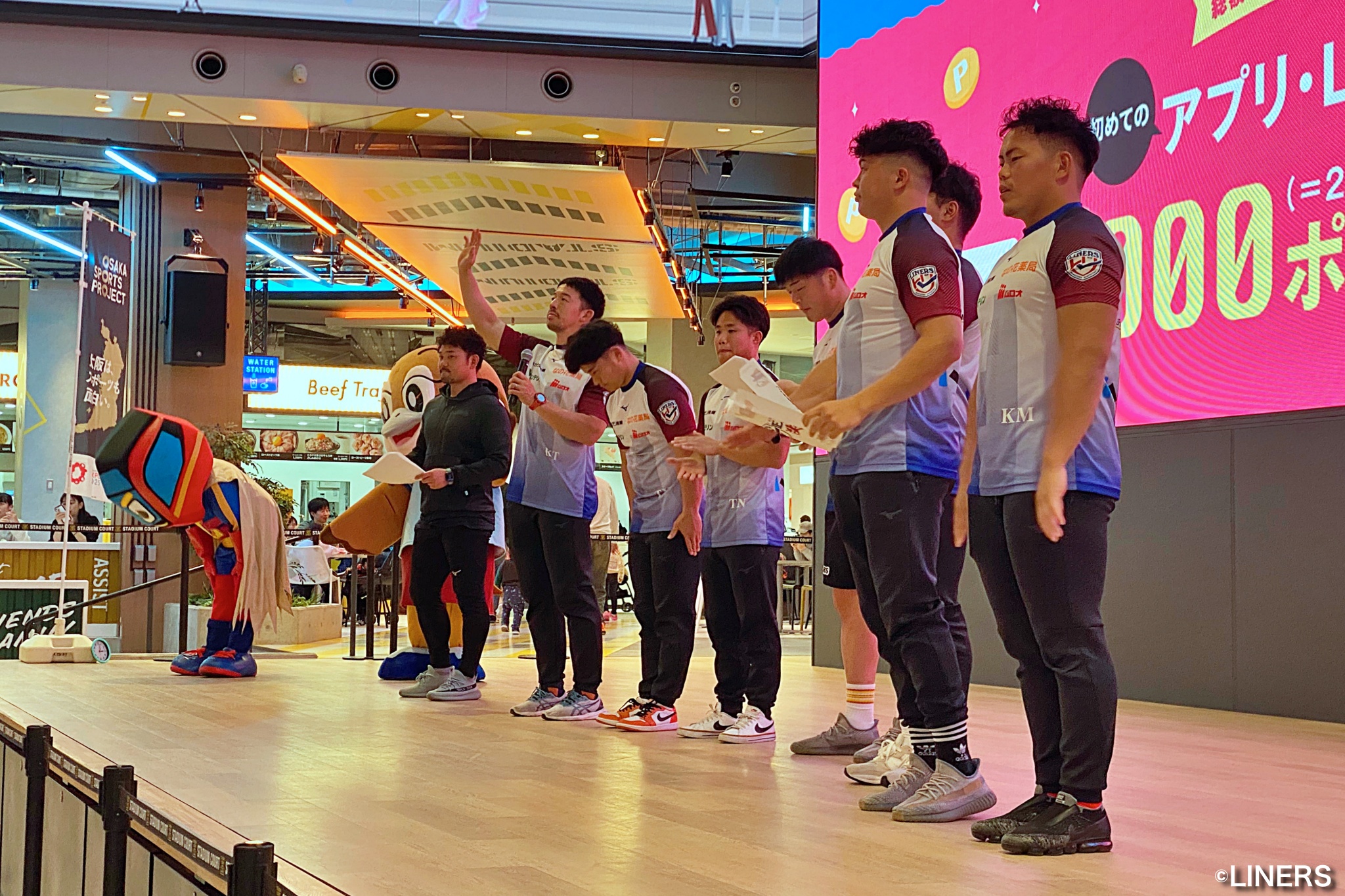 試合後にはじゃんけん大会を実施。勝者にはホスト開幕戦のチケットやライナーズグッズをプレゼントしました。ららぽーと堺様、大阪スポーツコミッション様、ご参加いただいたみなさま、ありがとうございました。
