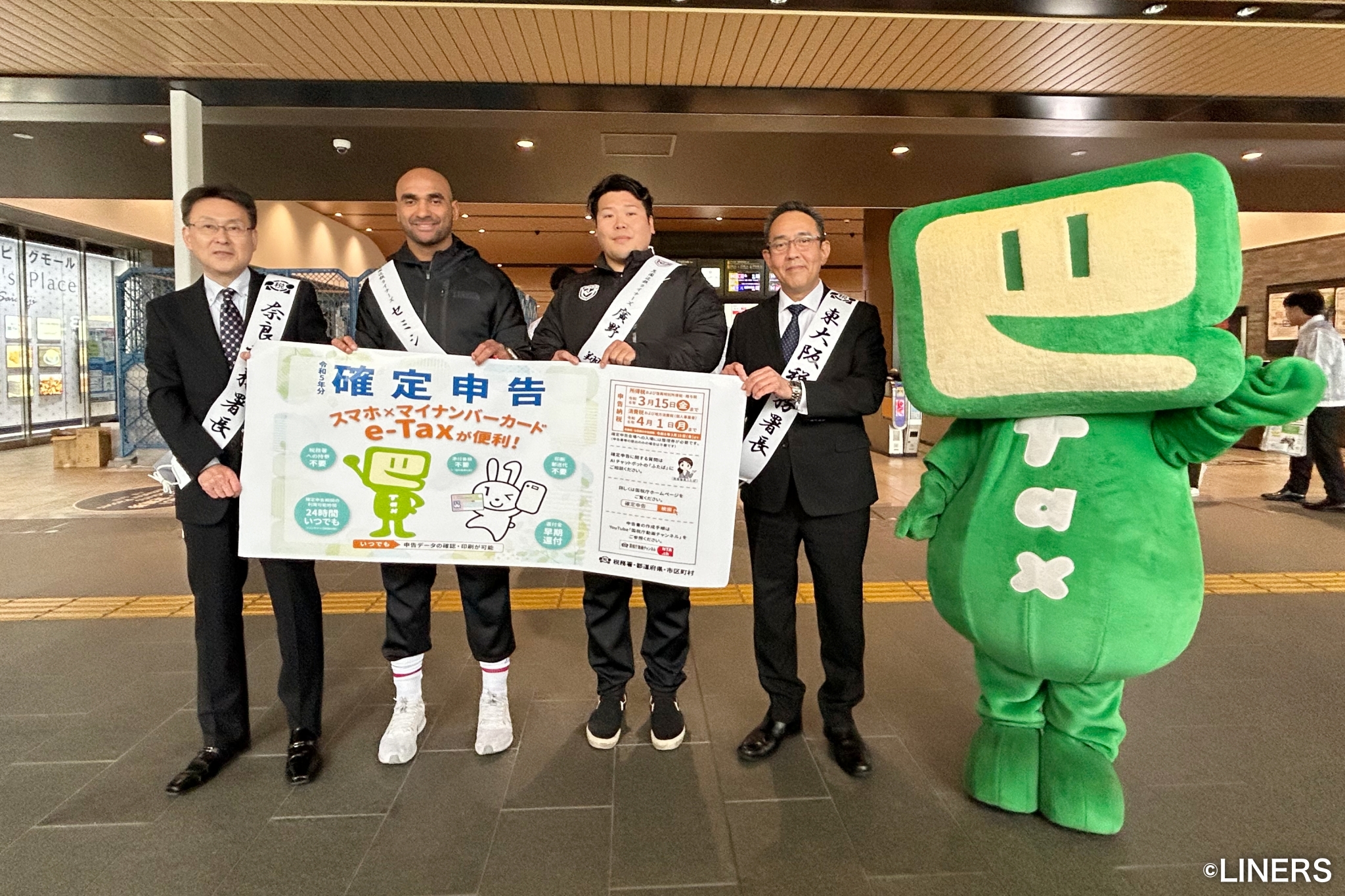 1月11日(木)、花園近鉄ライナーズは大和西大寺駅にて奈良税務署・東大阪税務署が実施するスマホ申告とキャッシュレス納付の啓発活動に参加しました。