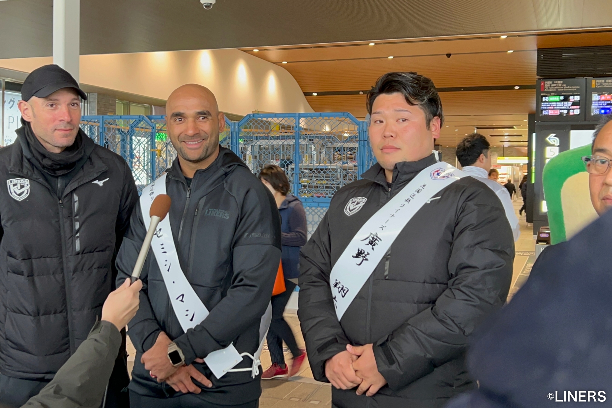 朝の通勤ラッシュに合わせセミシ・マシレワ選手と廣野翔太選手が啓発品を配布し、行き交う人々の目を引きました。