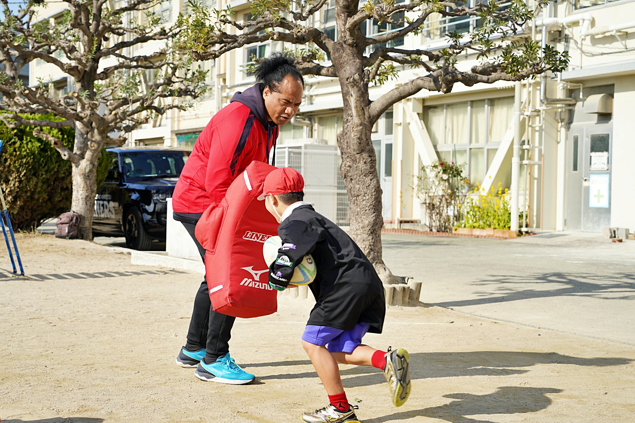 5年生にラグビー体験を実施。登場から大歓迎いただき、終始大盛り上がりの2時間でした。
