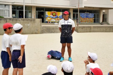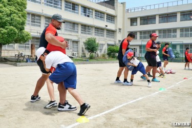 北中道小学校の6年生にラグビー体験。1時間という短い時間でしたが、児童のみなさんが素早く行動してくれて、たくさんのゲームで遊ぶことができました。