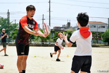 妙見坂小学校の5年生にラグビー体験。ラグビーボールに触れるのが初めてという児童がほとんどでしたが、声を掛け合いながらみんなが思いやりを持って取り組んでくれました。