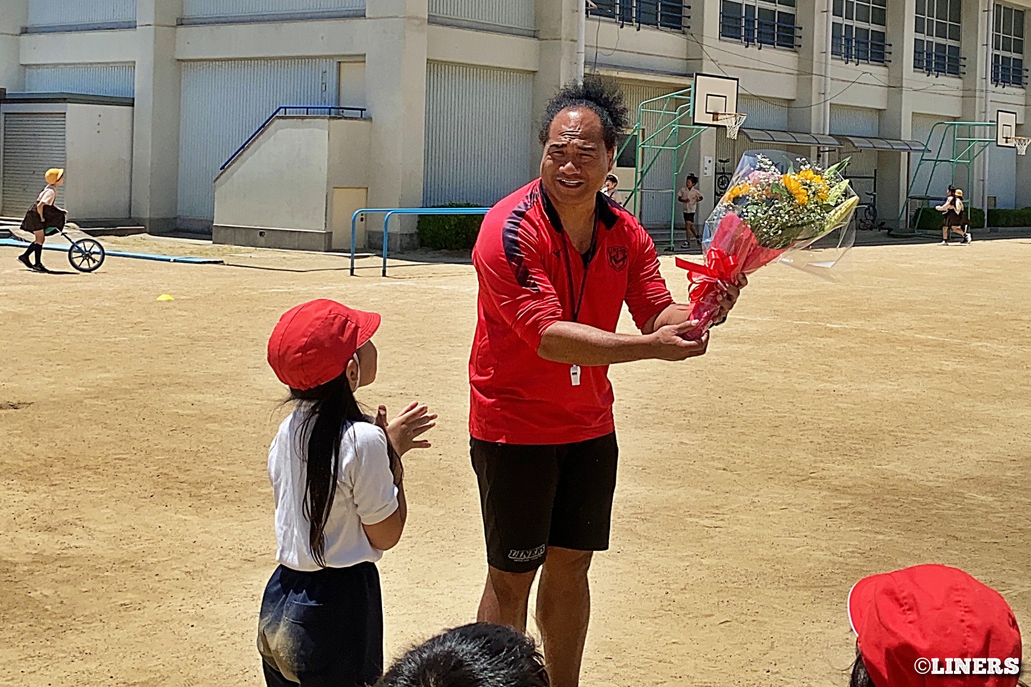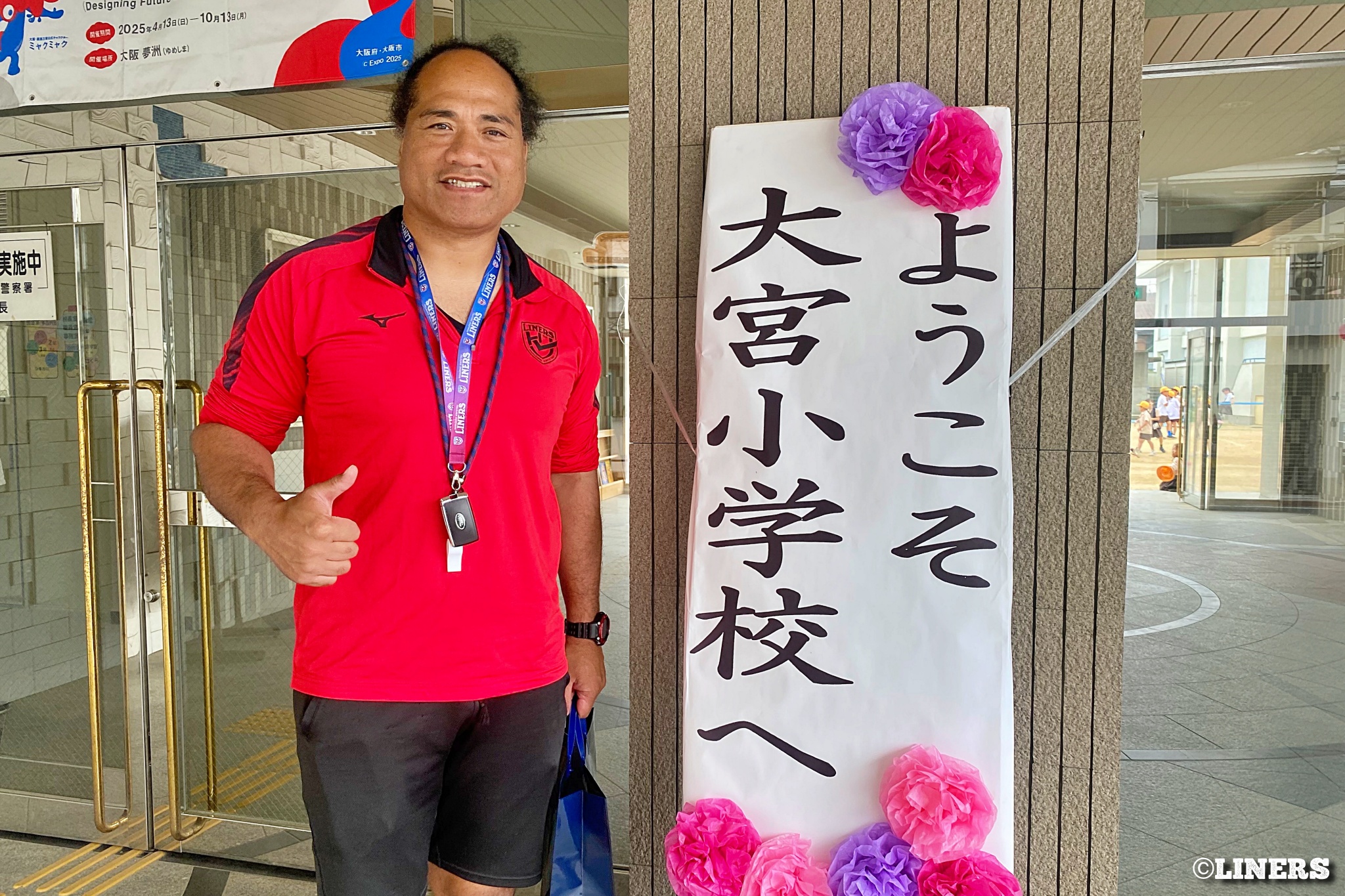 大宮小学校の2年生にラグビー体験。2年生らしく元気いっぱいに取り組んでくれました。ウェルカムボードを用意いただいたり体験後には花束もいただきました。
