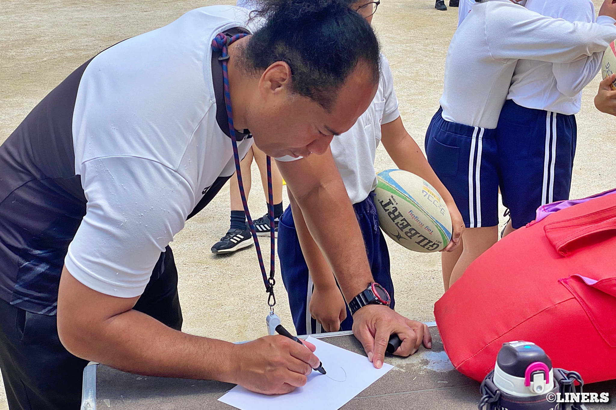北中島小学校の6年生にラグビー体験。ラグビーボールを触るのが初めてという児童がほとんどで、「思いやりとは何か?」を考えながら取り組んでもらいました。最後にはサインを求めて長蛇の列ができていました。