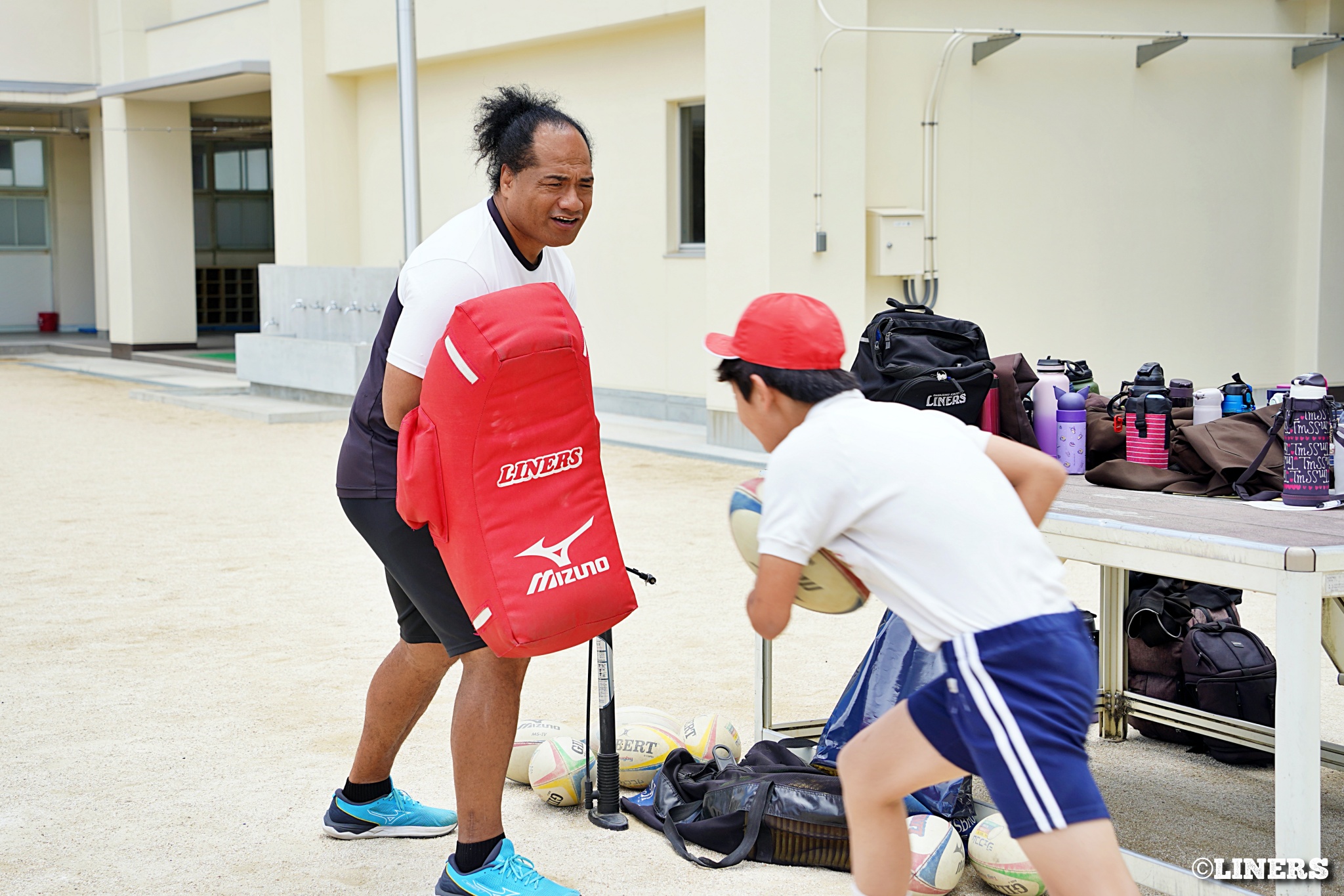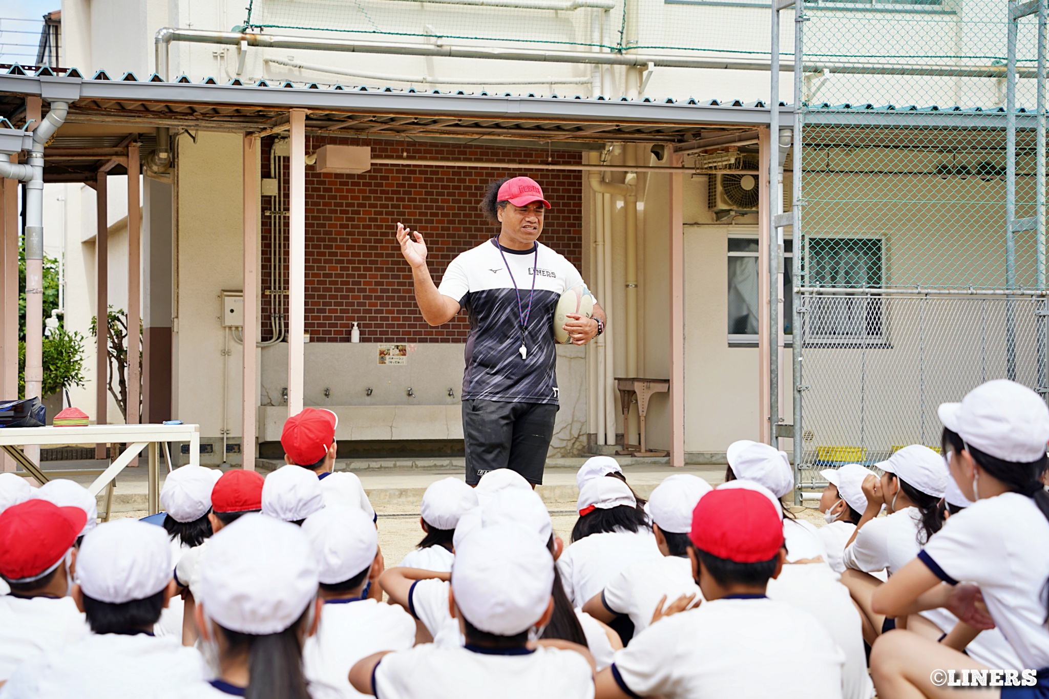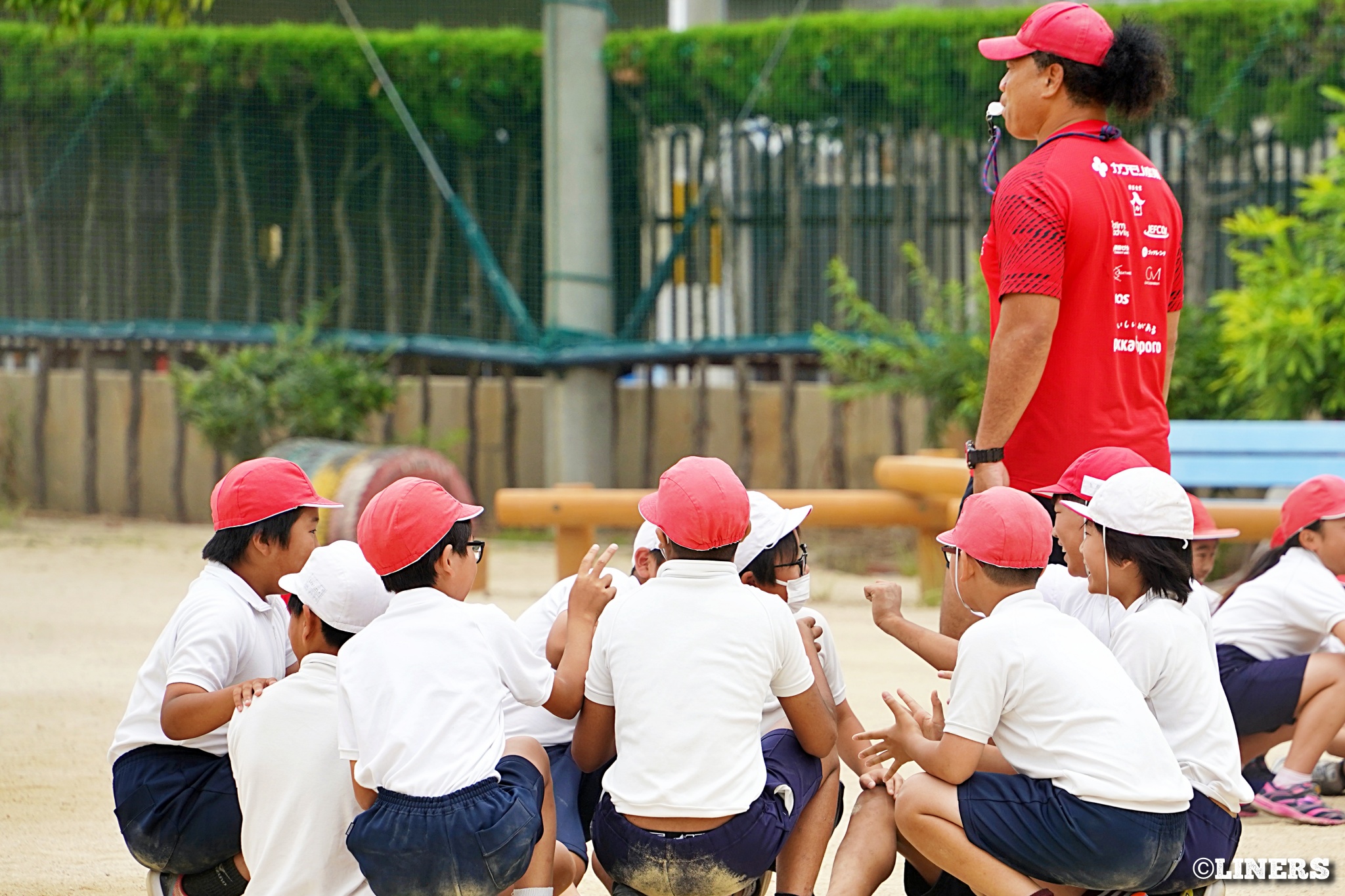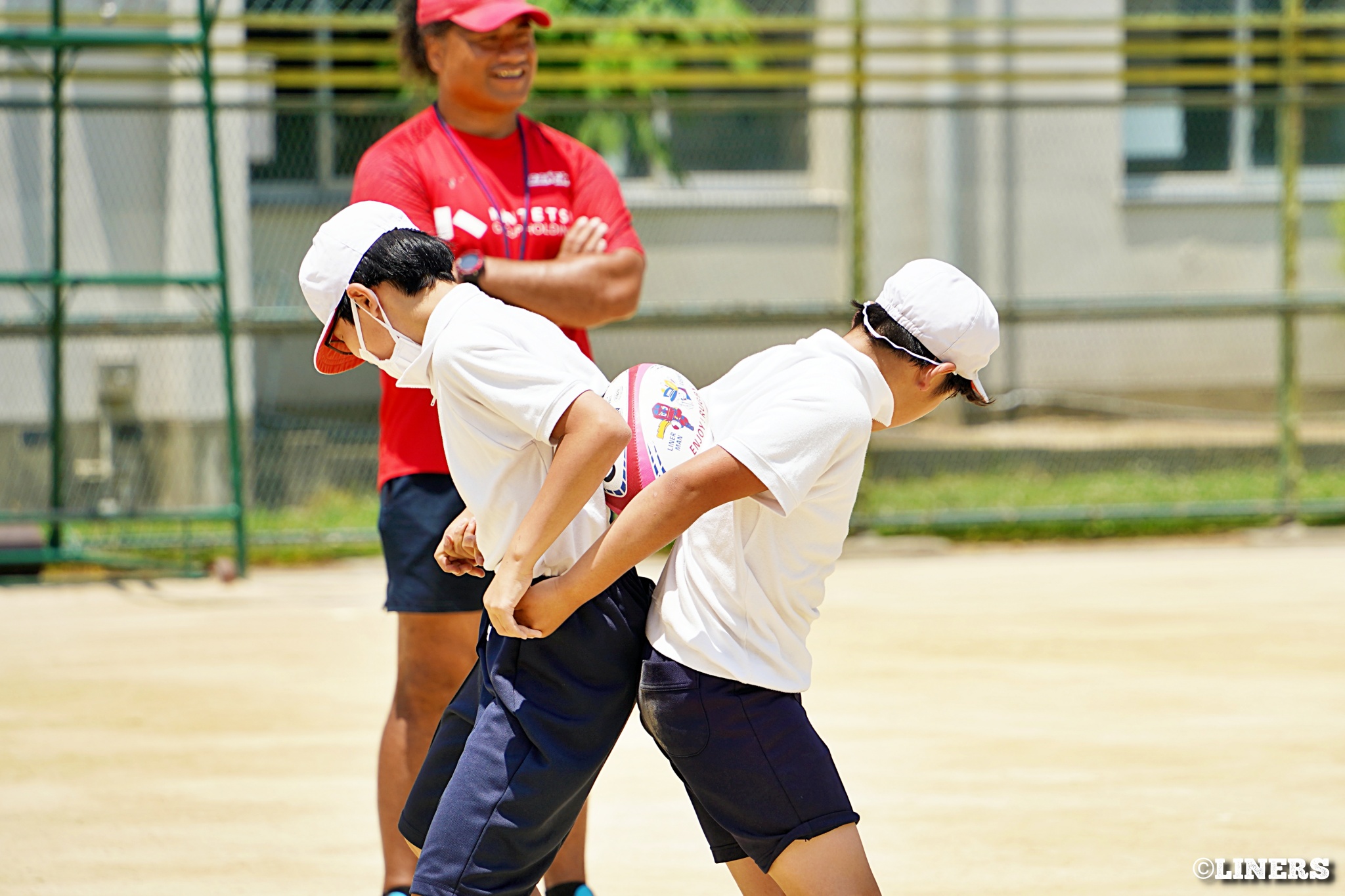 茨田南小学校の6年生にラグビー体験を行いました。この日から普及活動用のラグビーボールを新調。ライナーズのマスコットキャラクター「ライナマン」とSNS広報担当の「ラビナーくん」があしらわれたボールです。新品のボールで児童のみなさんもテンションMAX。いつも以上にラグビー体験が盛り上がりました。