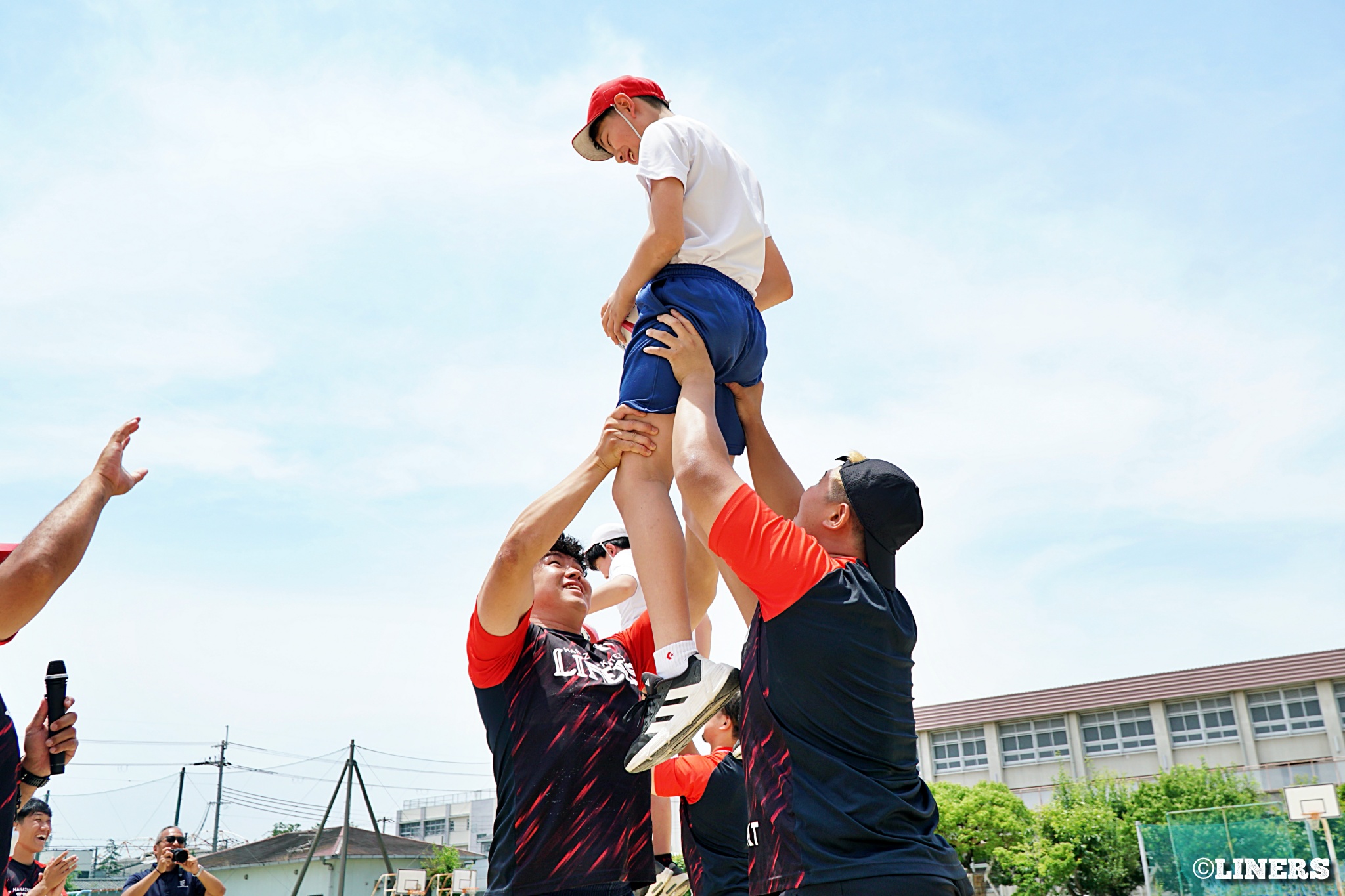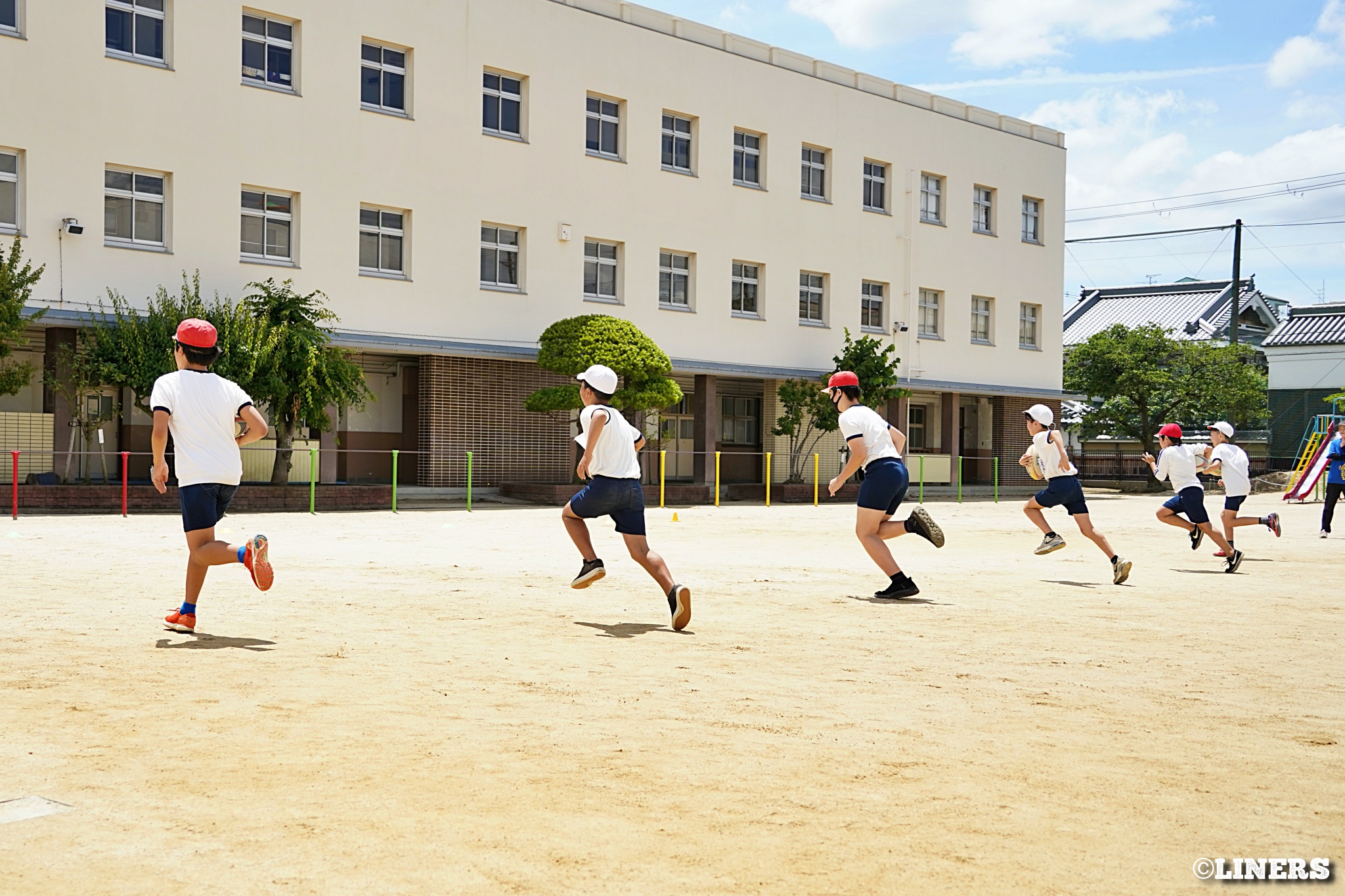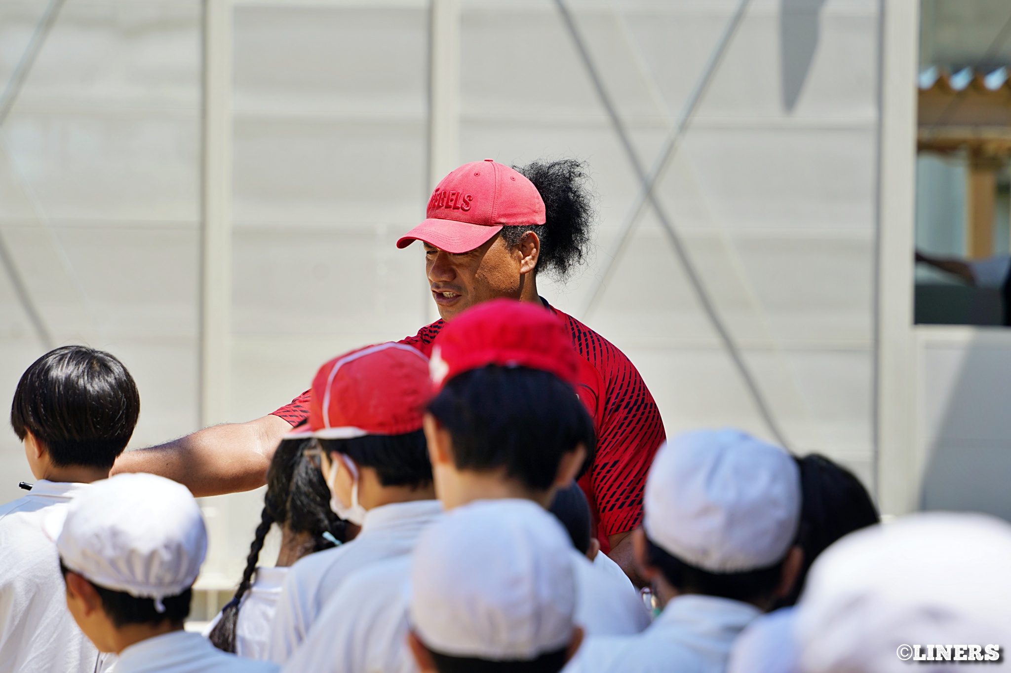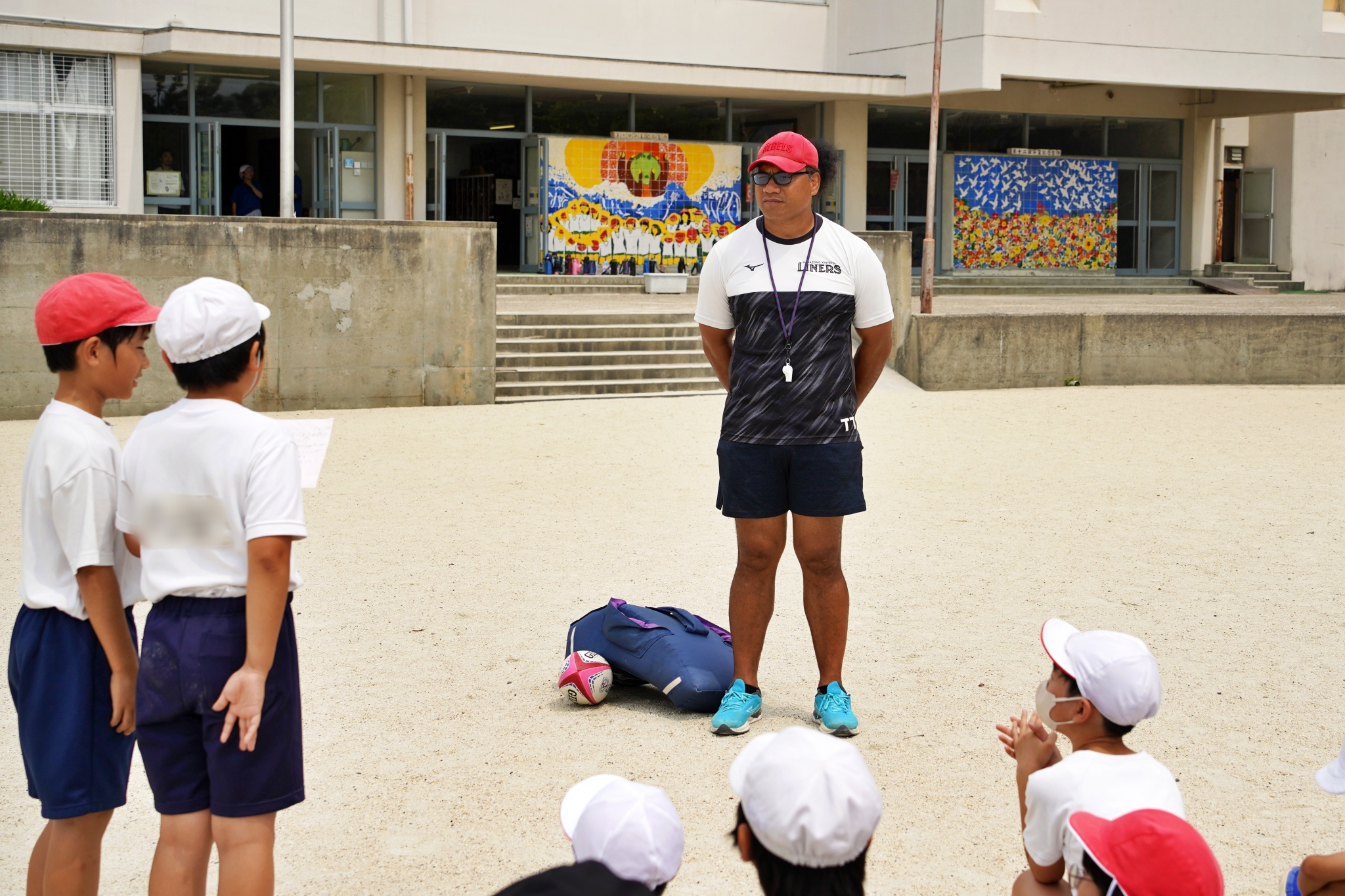 茨田南小学校の6年生にラグビー体験を行いました。この日から普及活動用のラグビーボールを新調。ライナーズのマスコットキャラクター「ライナマン」とSNS広報担当の「ラビナーくん」があしらわれたボールです。新品のボールで児童のみなさんもテンションMAX。いつも以上にラグビー体験が盛り上がりました。