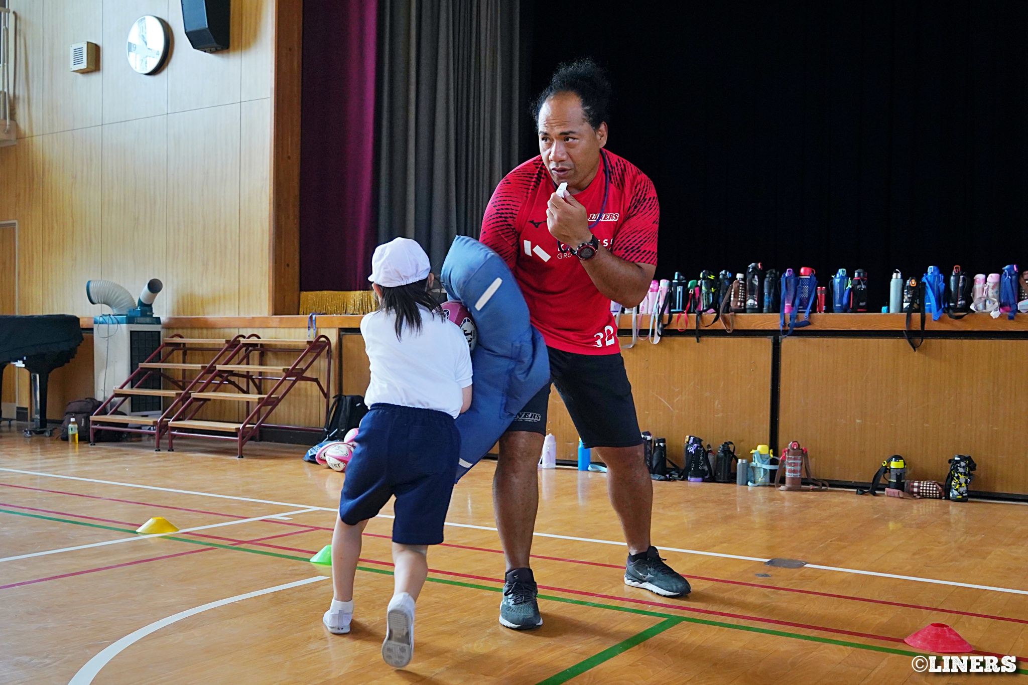 東中浜小学校の2年生にラグビー体験を行いました。ボールを持って相手に当たる体験は全員が参加。1時間という短い時間でしたが、テーマの「思いやり」を考えながら取り組んでもらいました。