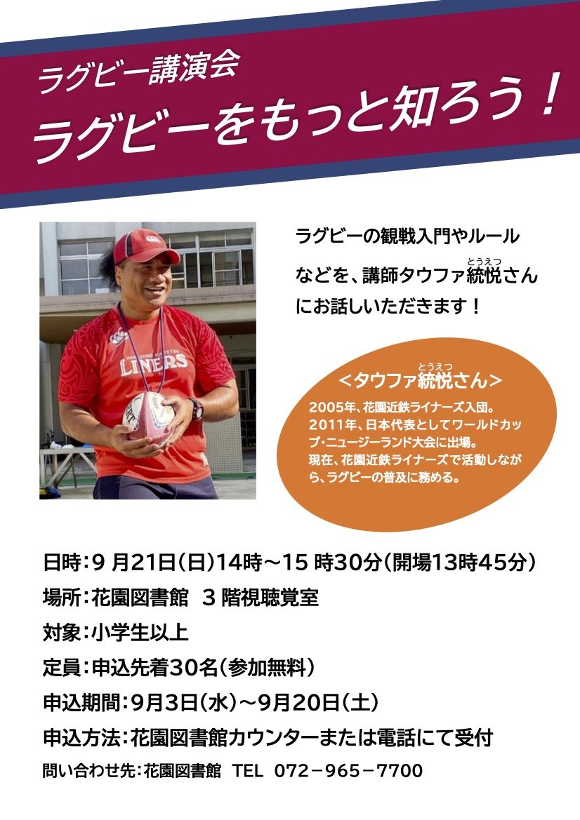 2025年9月21日(日)、花園図書館にて「ラグビー講演会 ラグビーをもっと知ろう!」が開催されます。小学生以上が対象で、事前申込制。先着30名様です。