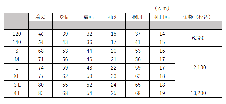 金額:120cm・140cm ¥6,380(税込)/S〜3L ¥12,100/4L ¥13,200